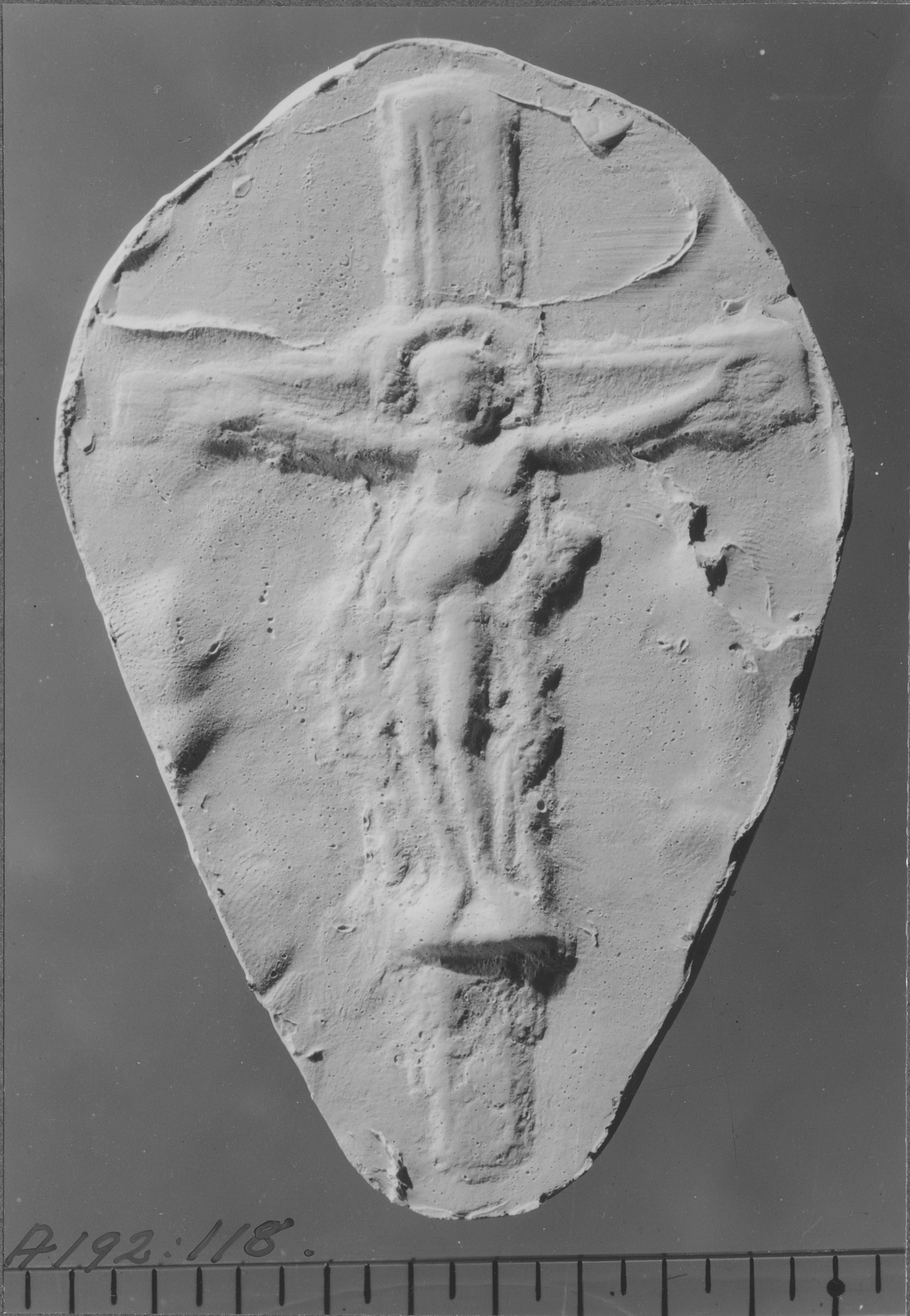 Beskrivning: Avgjutning av relief på storklockan, troligen från 1200-talet. Visar Kristus på korset.
