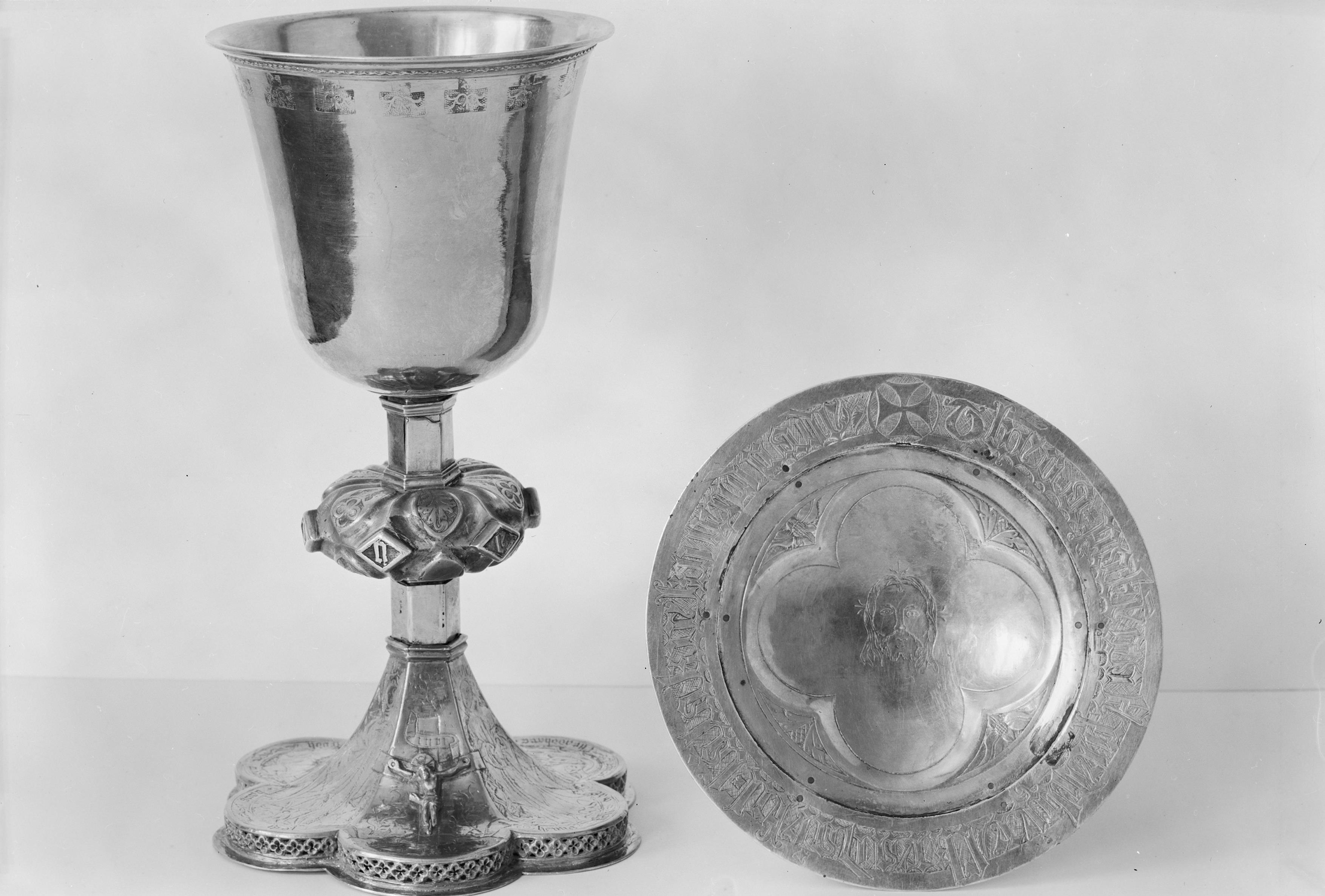 Beskrivning: Kalk av silver, förgylld. Foten 6-passformig med ornering. Patén av silver, förgylld. I fördjupningen graverat Kristushuvud.
