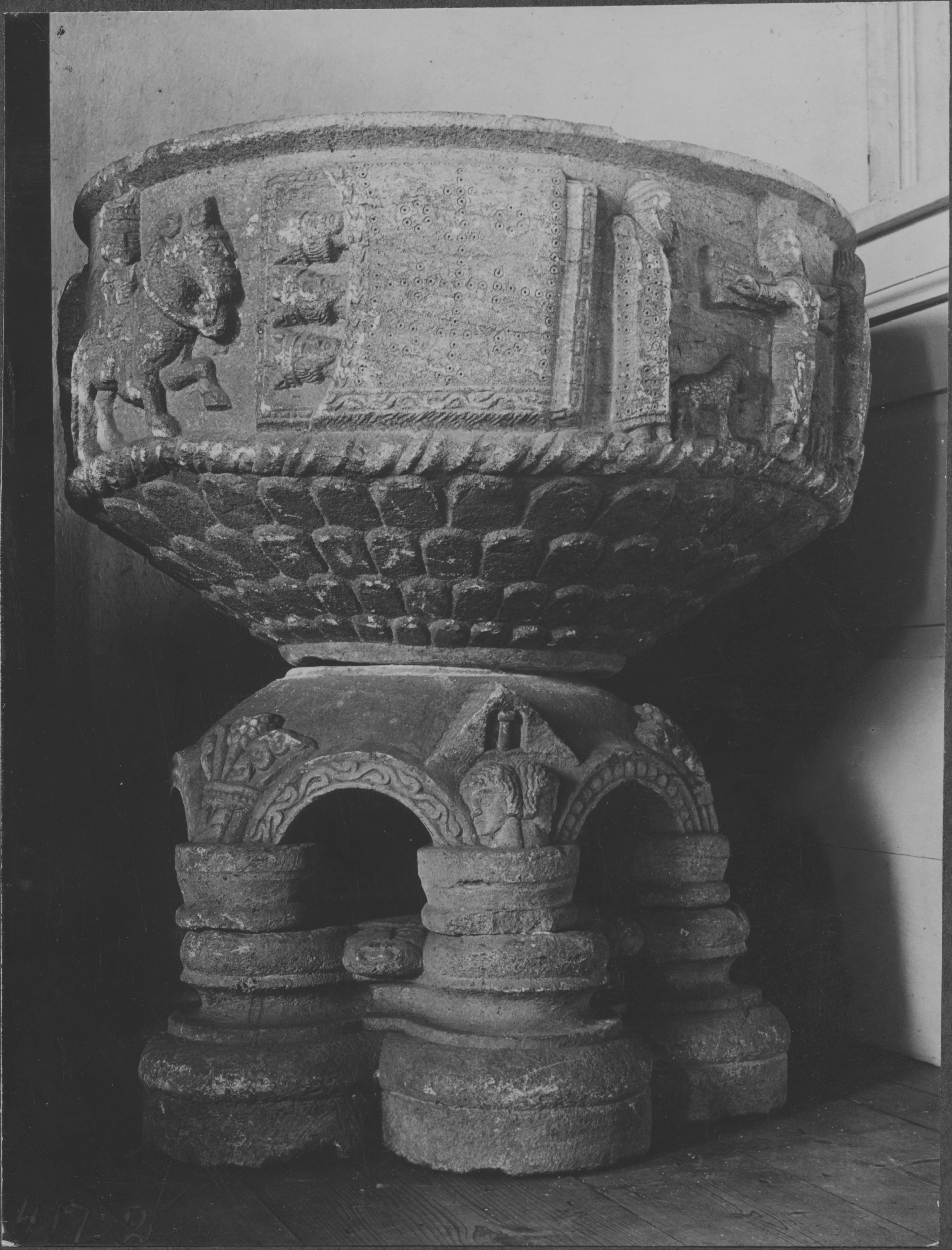 Beskrivning: Dopfunt av sandsten. Prydd med reliefframställningar av Jesu födelse och de tre konungarnas tillbedjan. från 1100-talet.