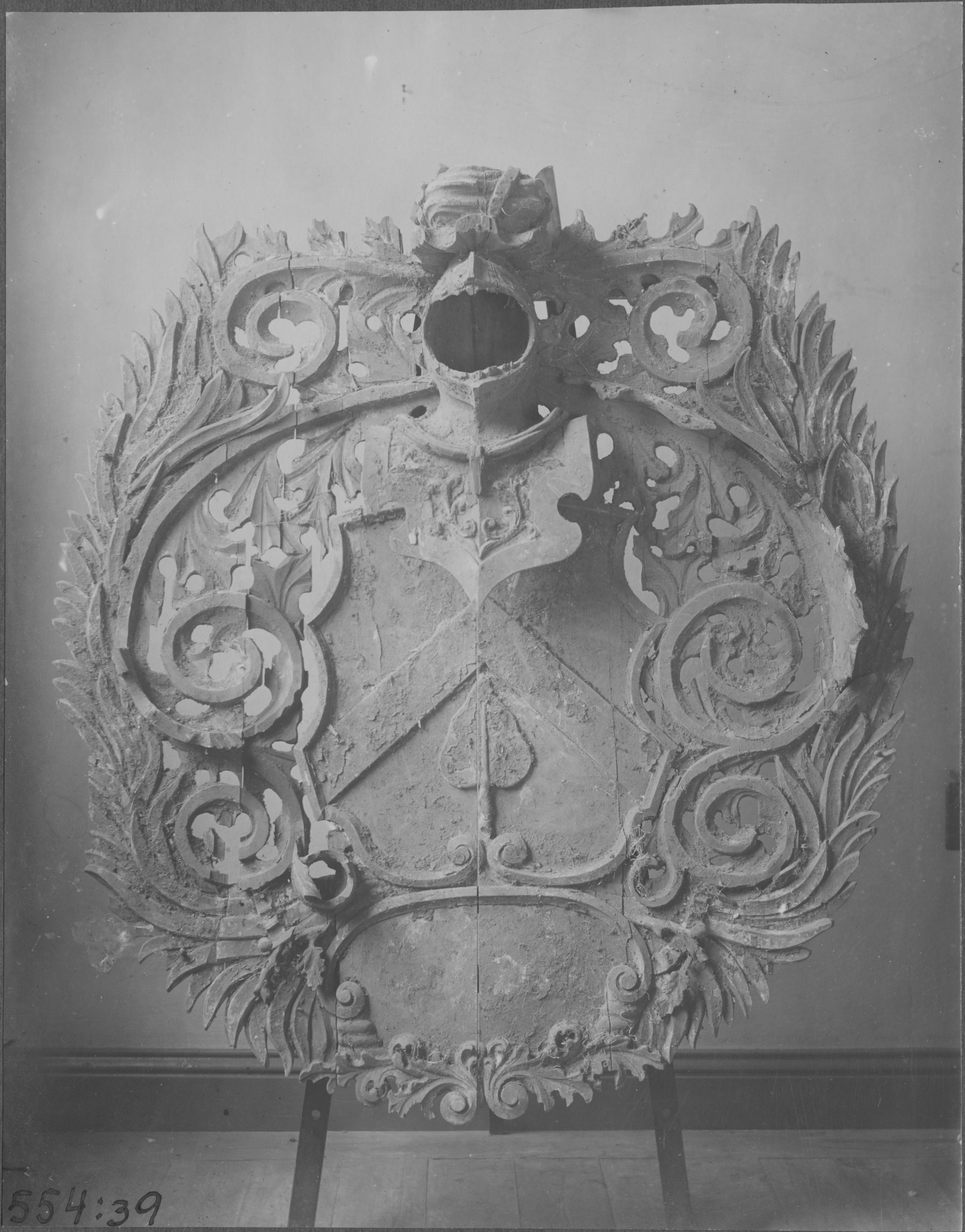 Beskrivning: Huvudbanér av trä, krederat och målat. Över en Ulfsparre. Ovalt hjärtvapen under vinkel. Före restaurering.