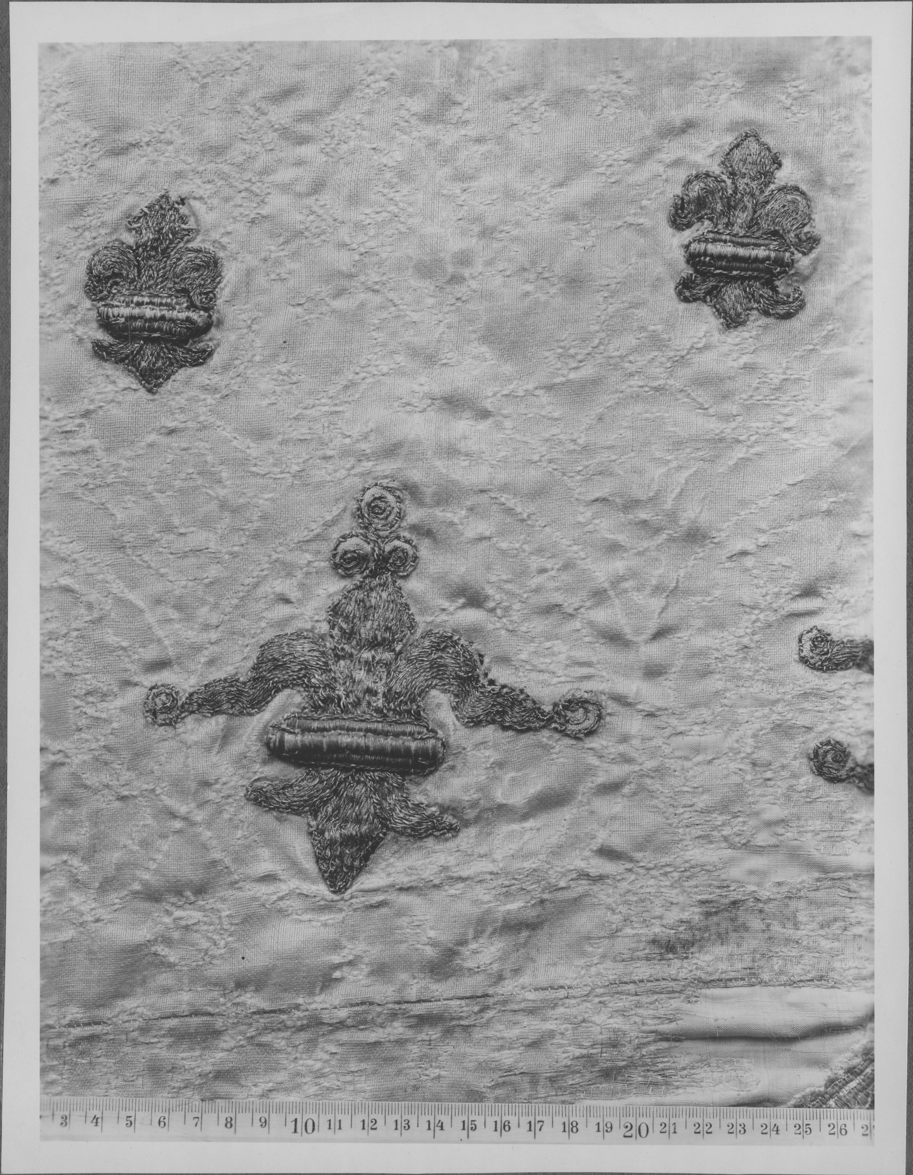 Beskrivning: Mässhake i vit granatäpplemönstrad sammet, detalj. Textilutställningen i Stockholm 1929. Nummer 177.