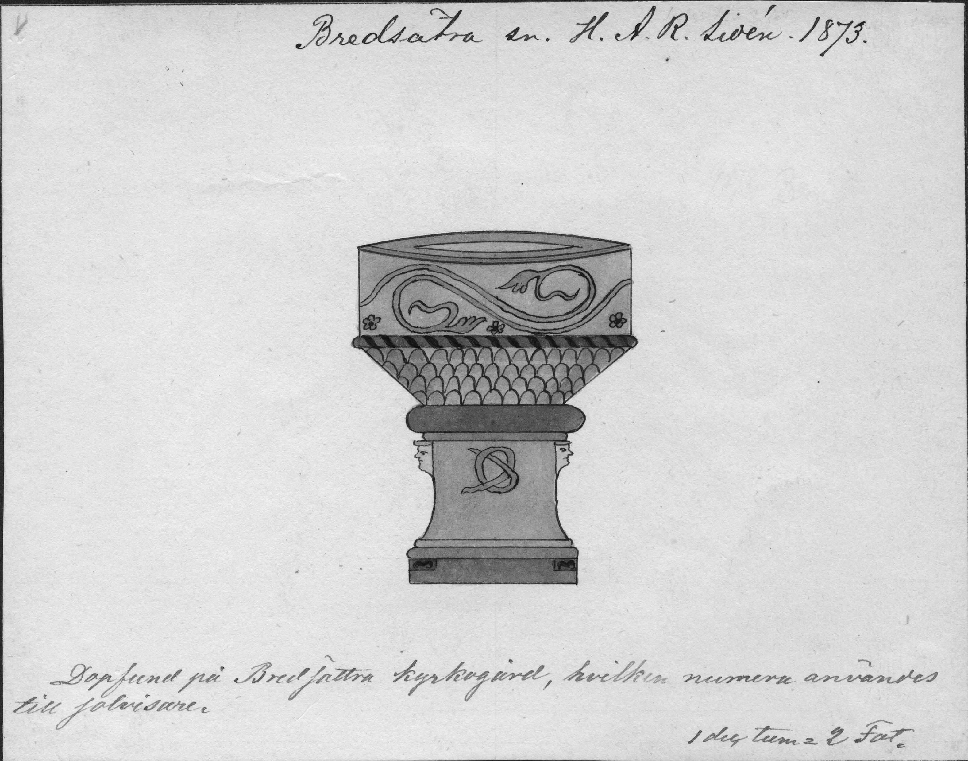 Beskrivning: Teckning föreställande dopfunt av sandsten från medeltiden, H. A. R. Sidén, 1873.