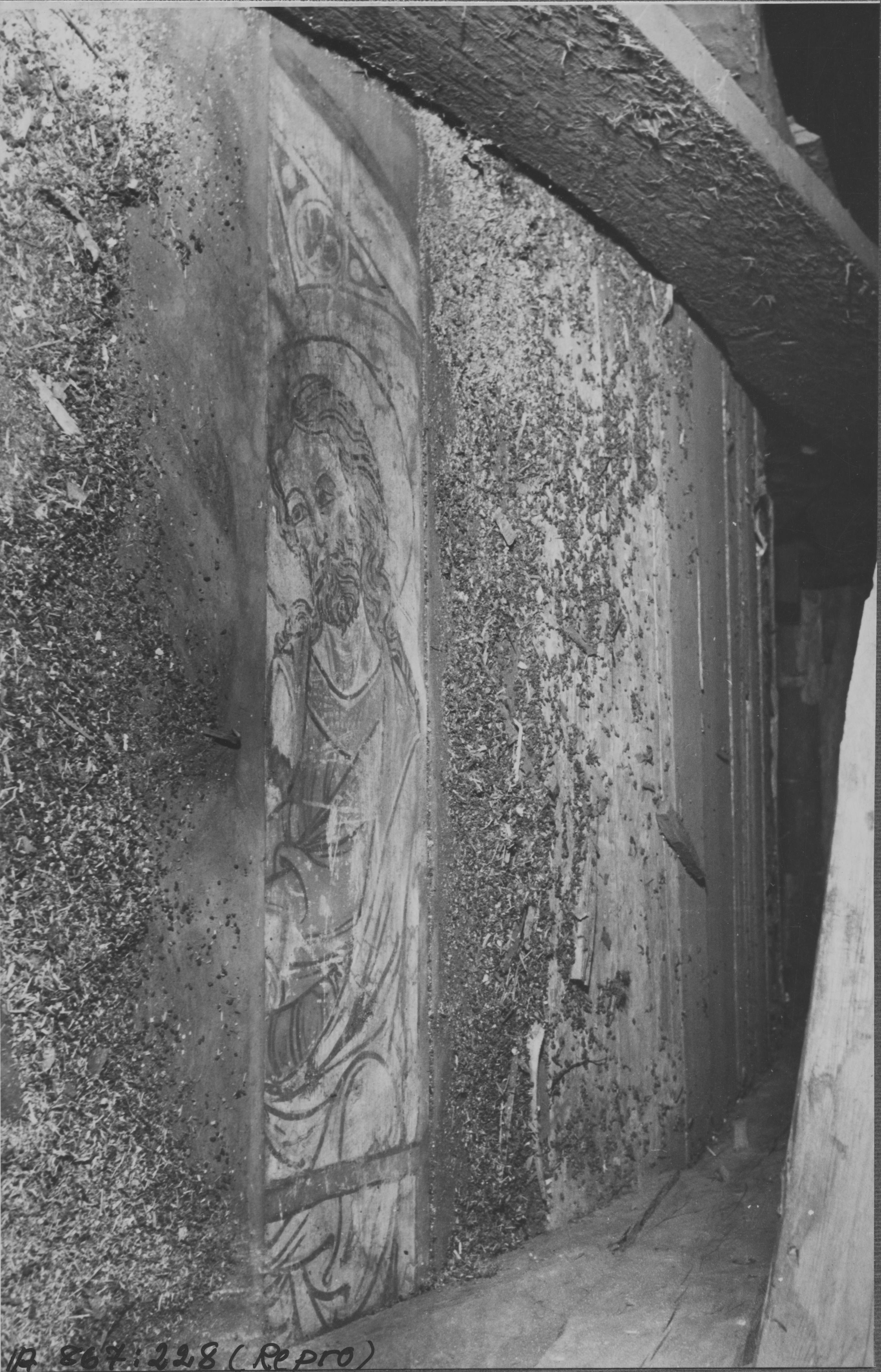 Beskrivning: Del av målad vägpanel. Vinden. Takbräde från stavkyrkan.