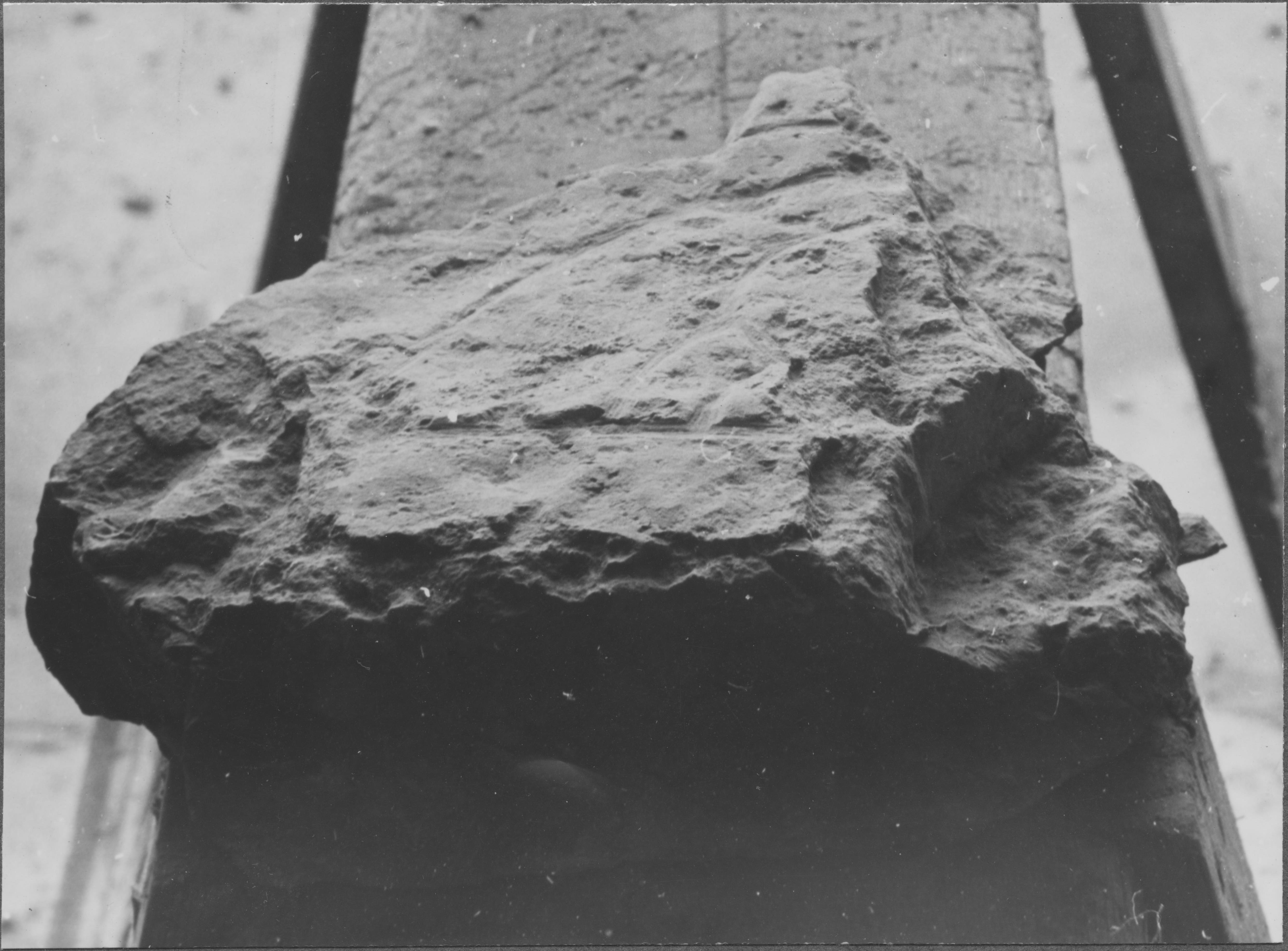 Beskrivning: Fragment av ornerad kalkstenskista. Sida I.