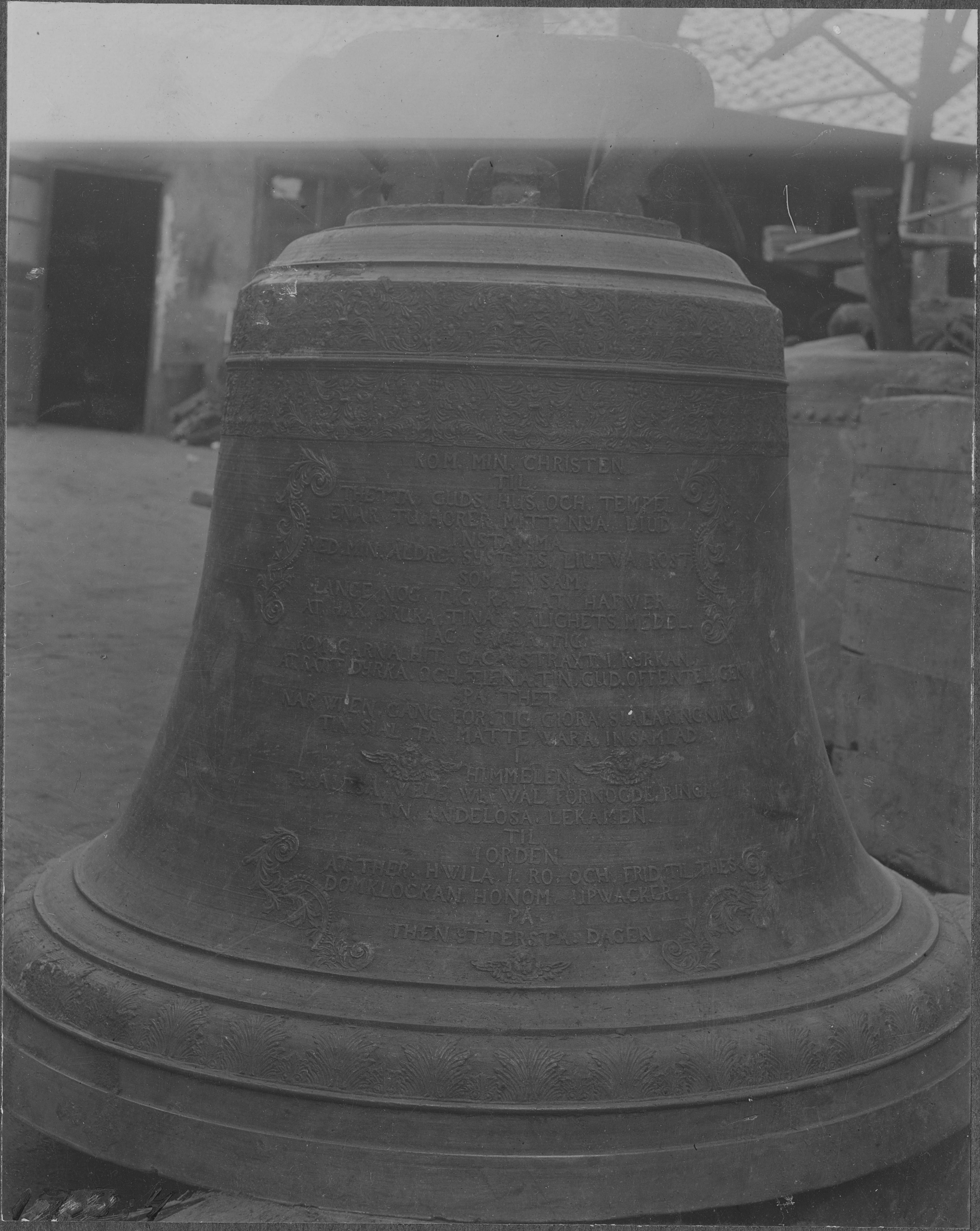 Beskrivning: Storklockan. Enligt inskrift omgjuten 1767. Ornerad med Kristus som världsdomare, Paulus, Petrus och evangelister. Vikt 1182 kg. Diameter 130 cm, höjd 132 cm.