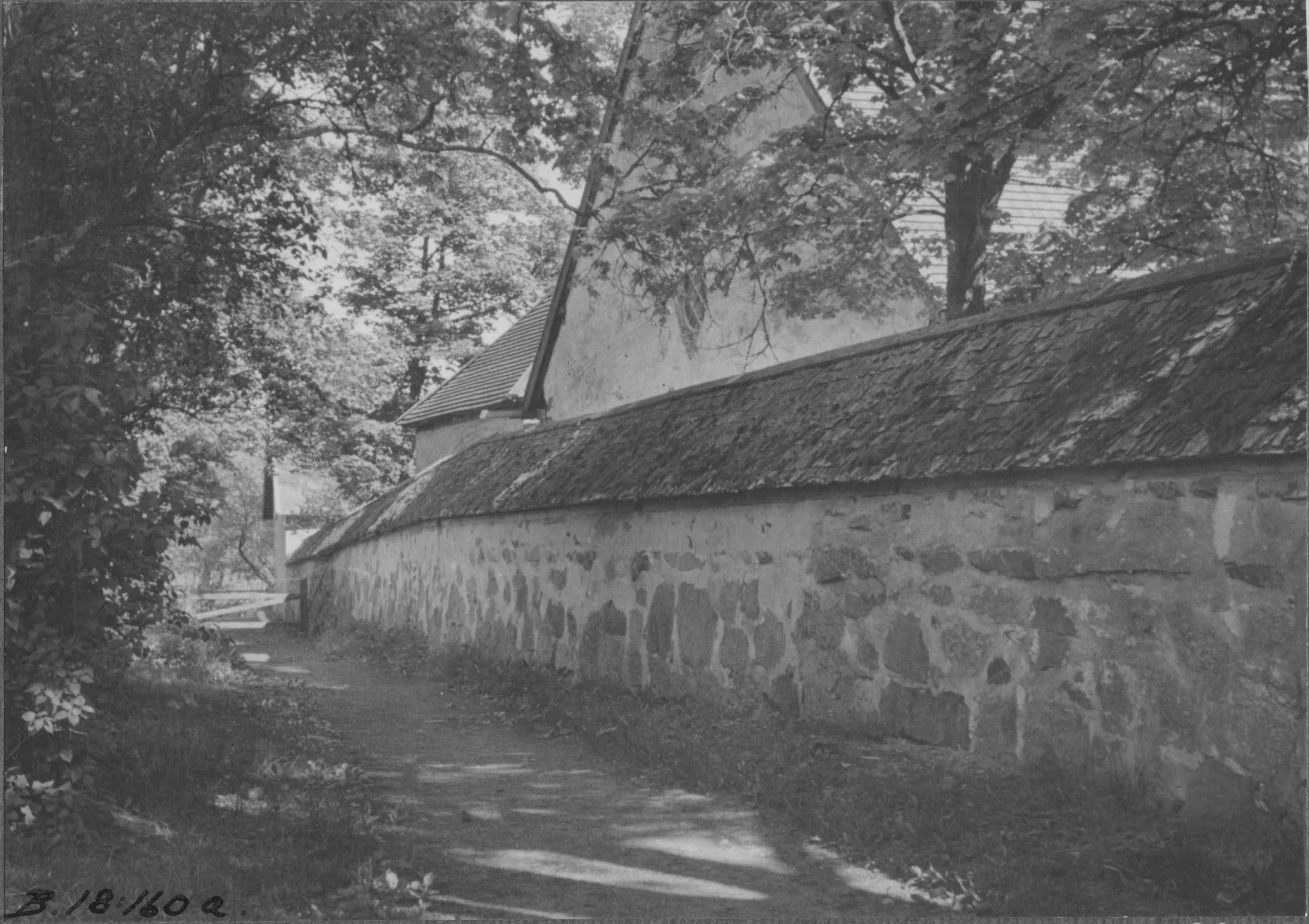 Beskrivning: Kyrkogårdsmuren med tjärade stickspån. Från nordväst.