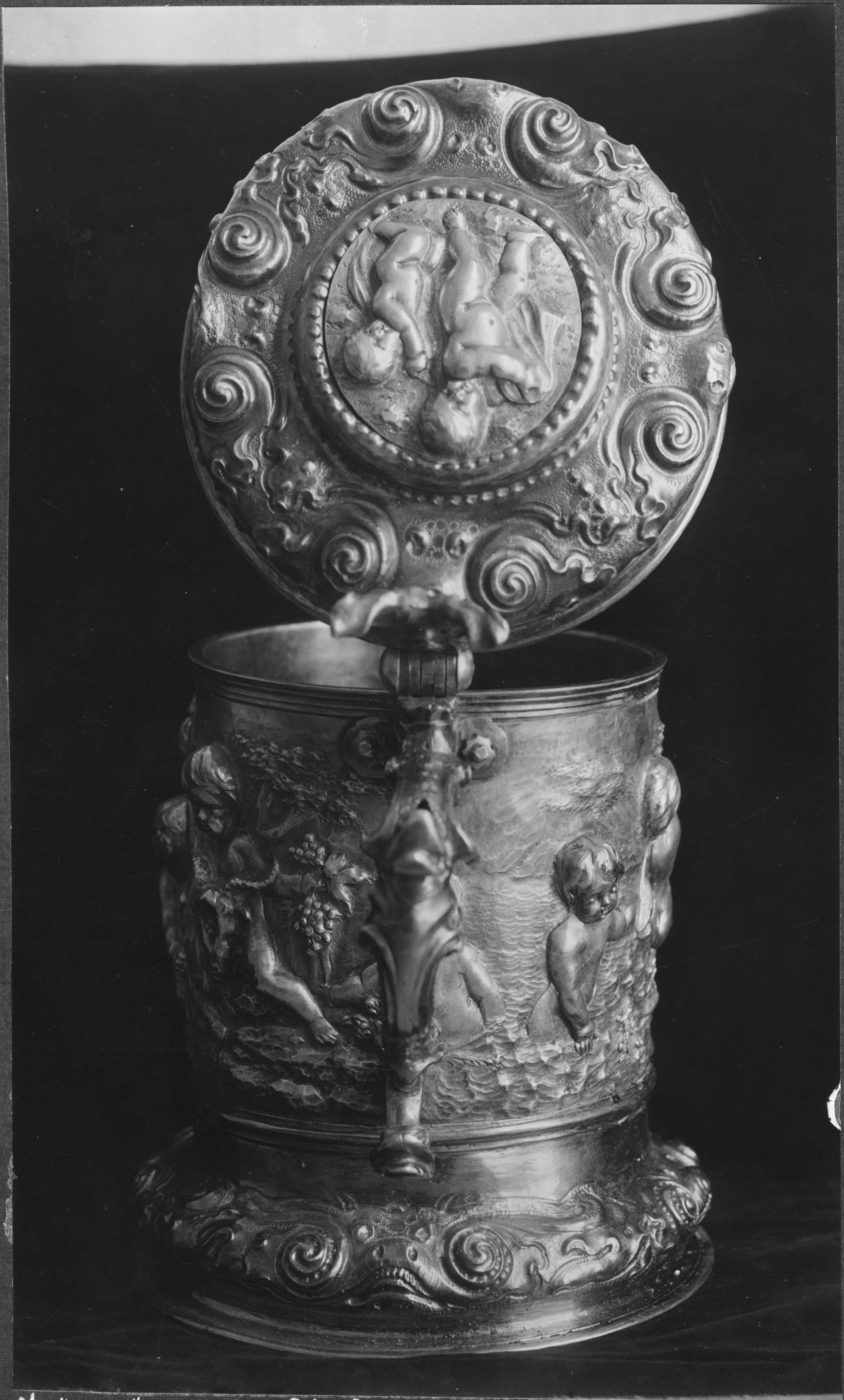 Beskrivning: Kanna av silver, till större delen förgylld. Dekorerad med barnfigurer lekande i ett landskap samt pressade och punsade ornament i broskstil. Högt drivet arbete. Omkring 1650, snabbinv.