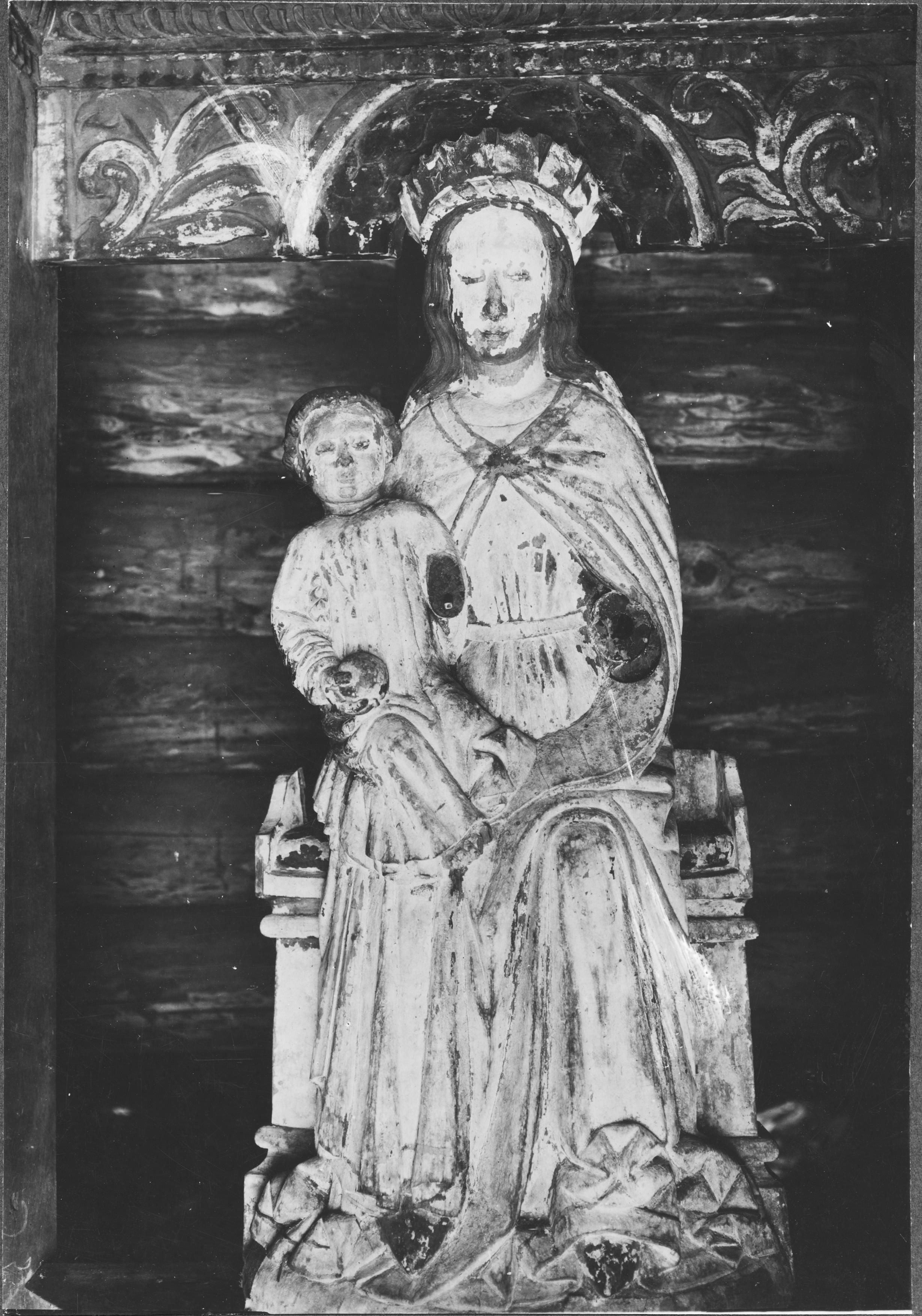 Beskrivning: Madonna med barnet. Träskulptur. 1500-talet, snabbinv.