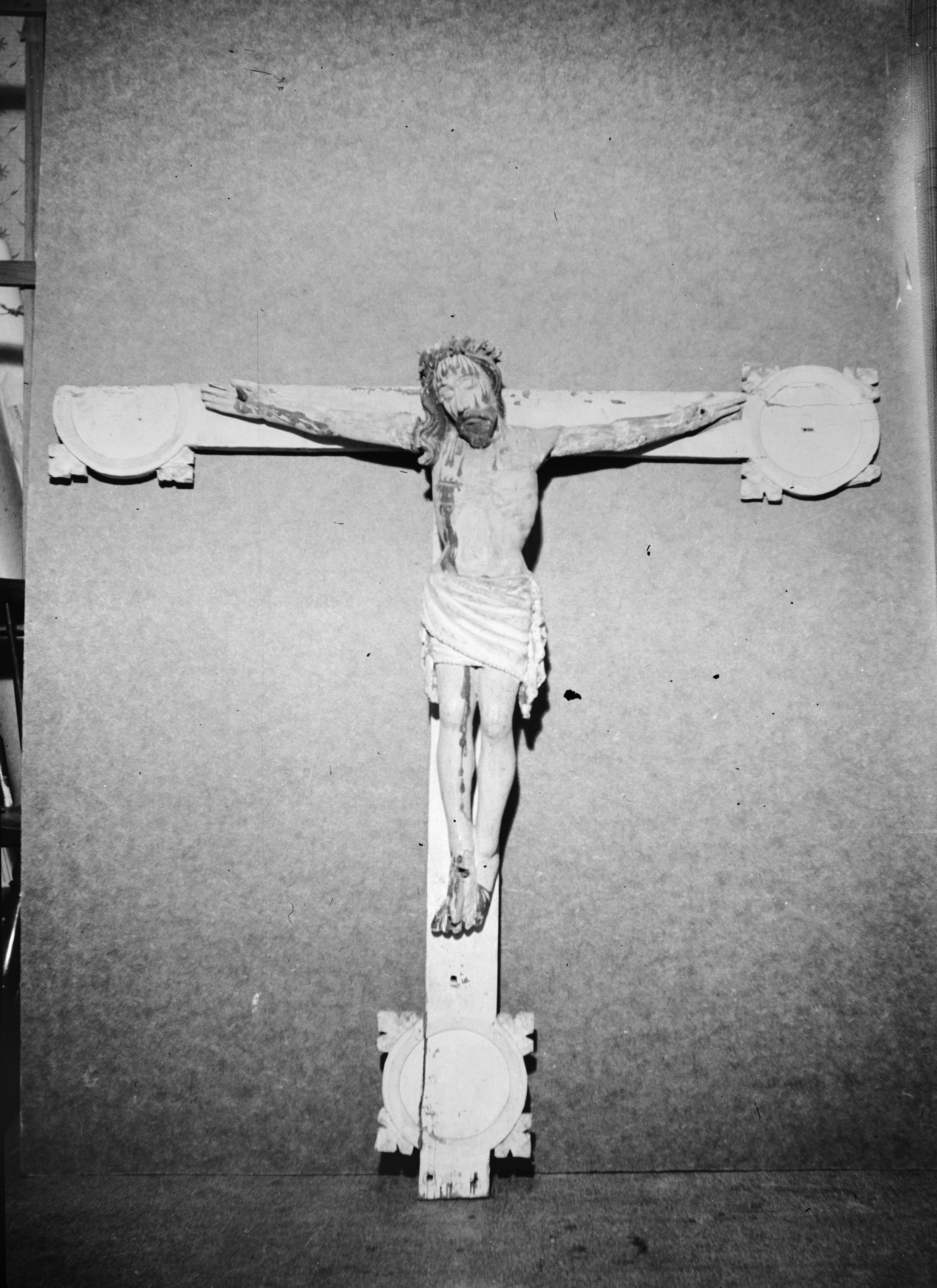 Beskrivning: Krucifix av trä. Kors med rundade fält och bladkrabbor på armarna. Törnkrans med ifästade taggar.I senare tid övermålat med gråblå oljefärg. H. 110 cm. Figurens höjd 75 cm. 1300-talet. Före konservering.