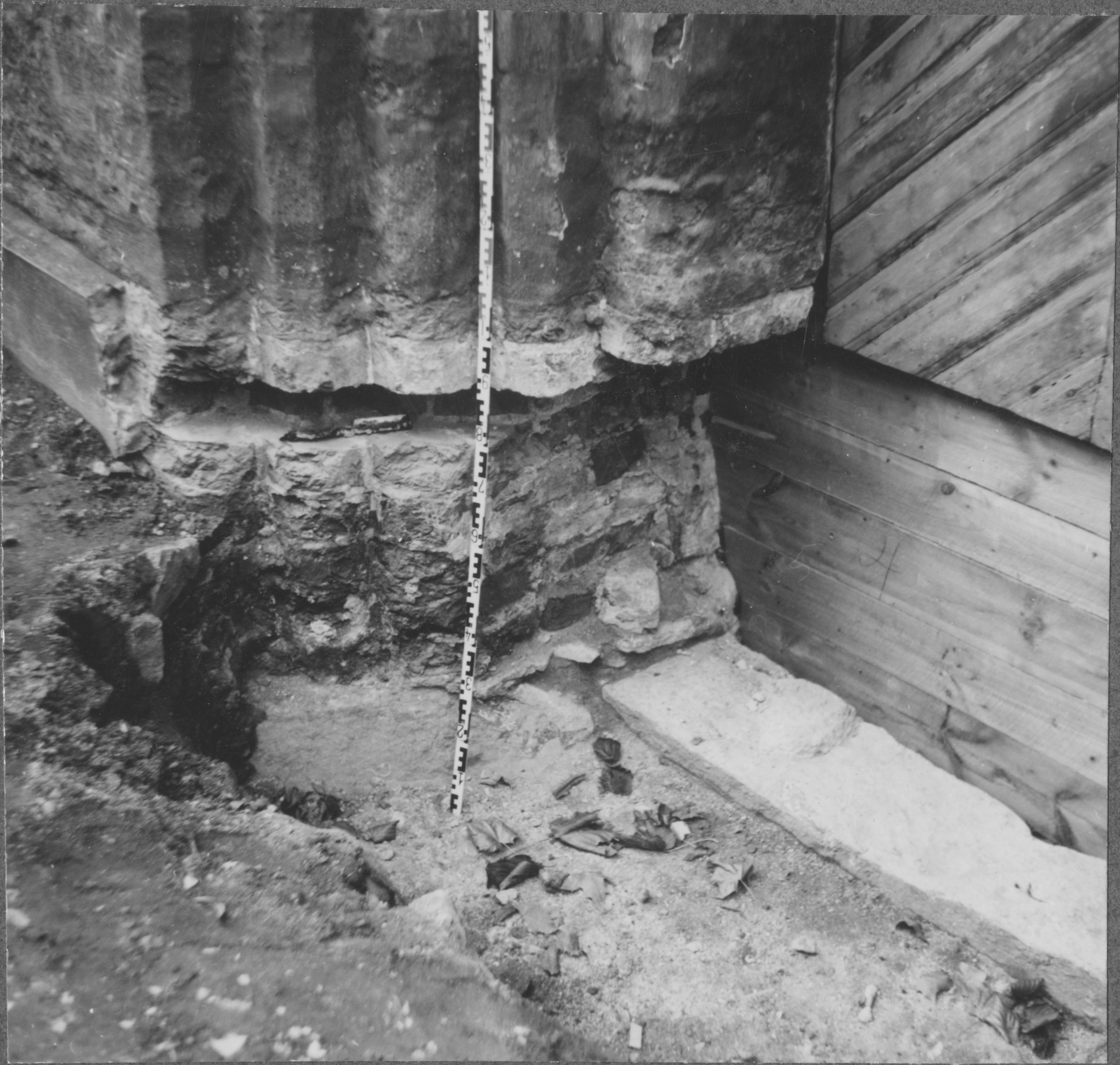 Beskrivning: Tröskelsten, den ursprungliga, blottad efter att två stenar borttagits. Vänstra sidan.