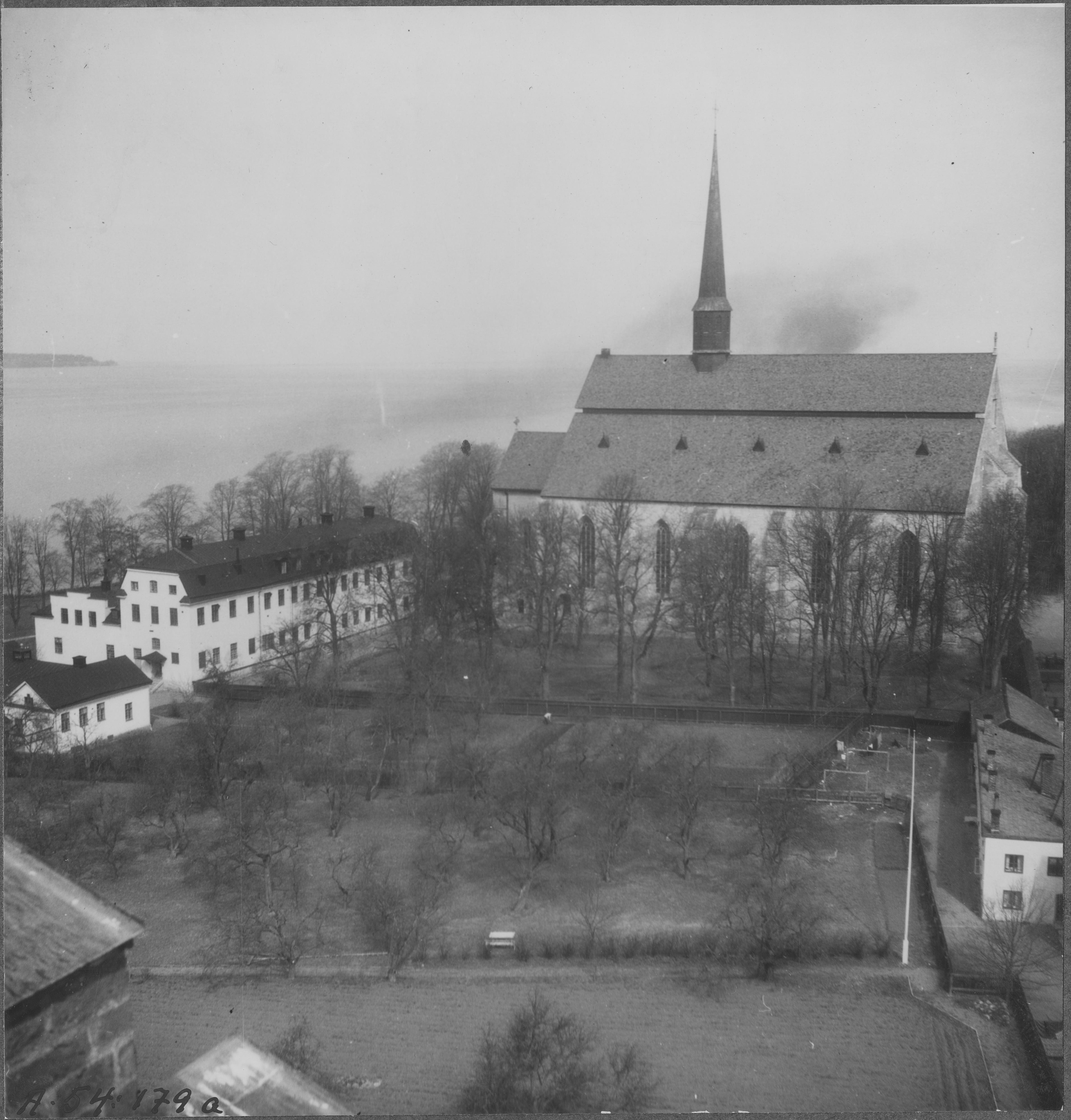 Beskrivning: Kyrkan med munkklostret till vänster och Gamla teatern till höger. Från sydost.
