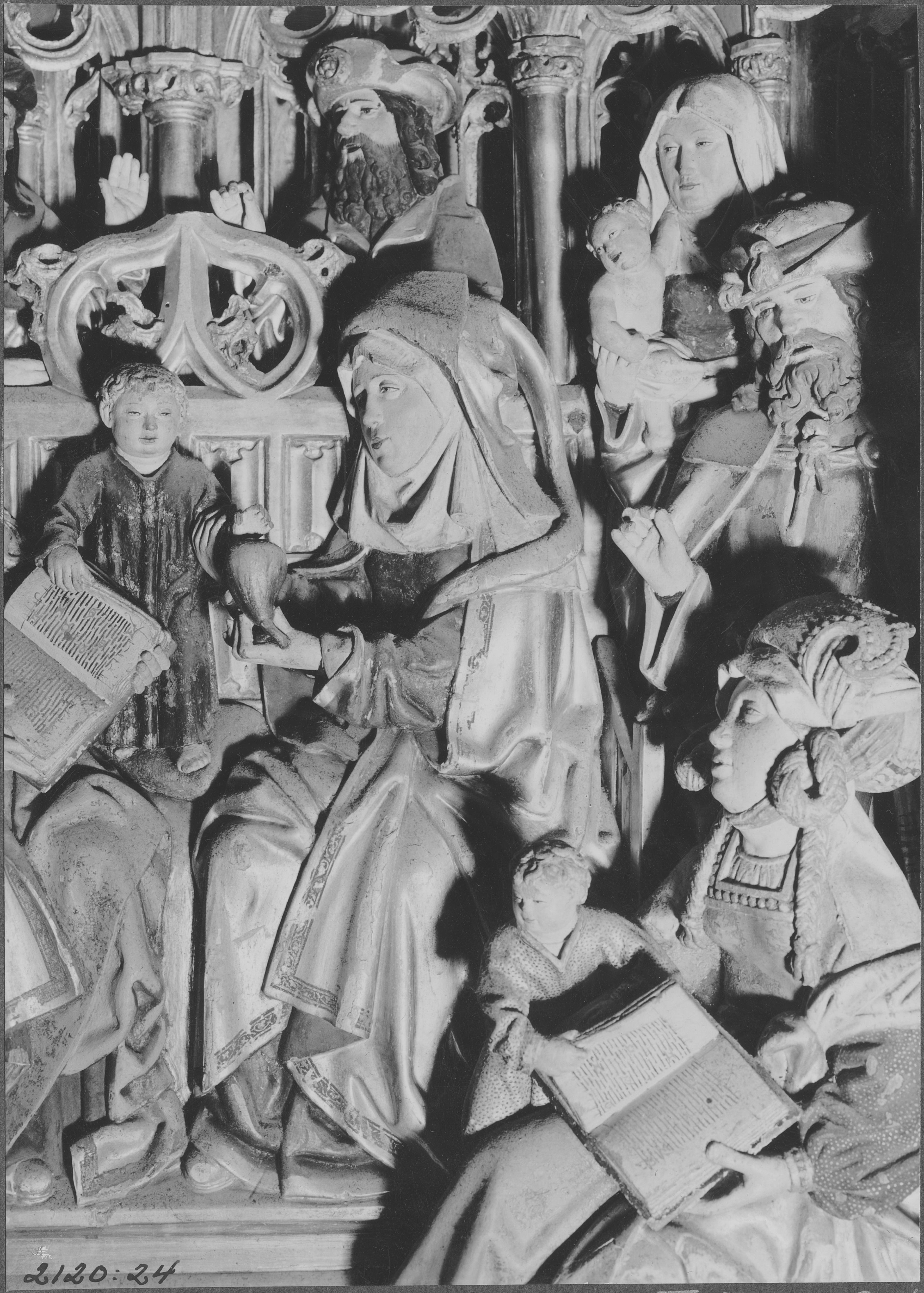 Beskrivning: Altarskåp av ek. Tillverkad i Brysselverkstad. Från 1500-talets första fjärdedel. Detalj, Heliga släkten.