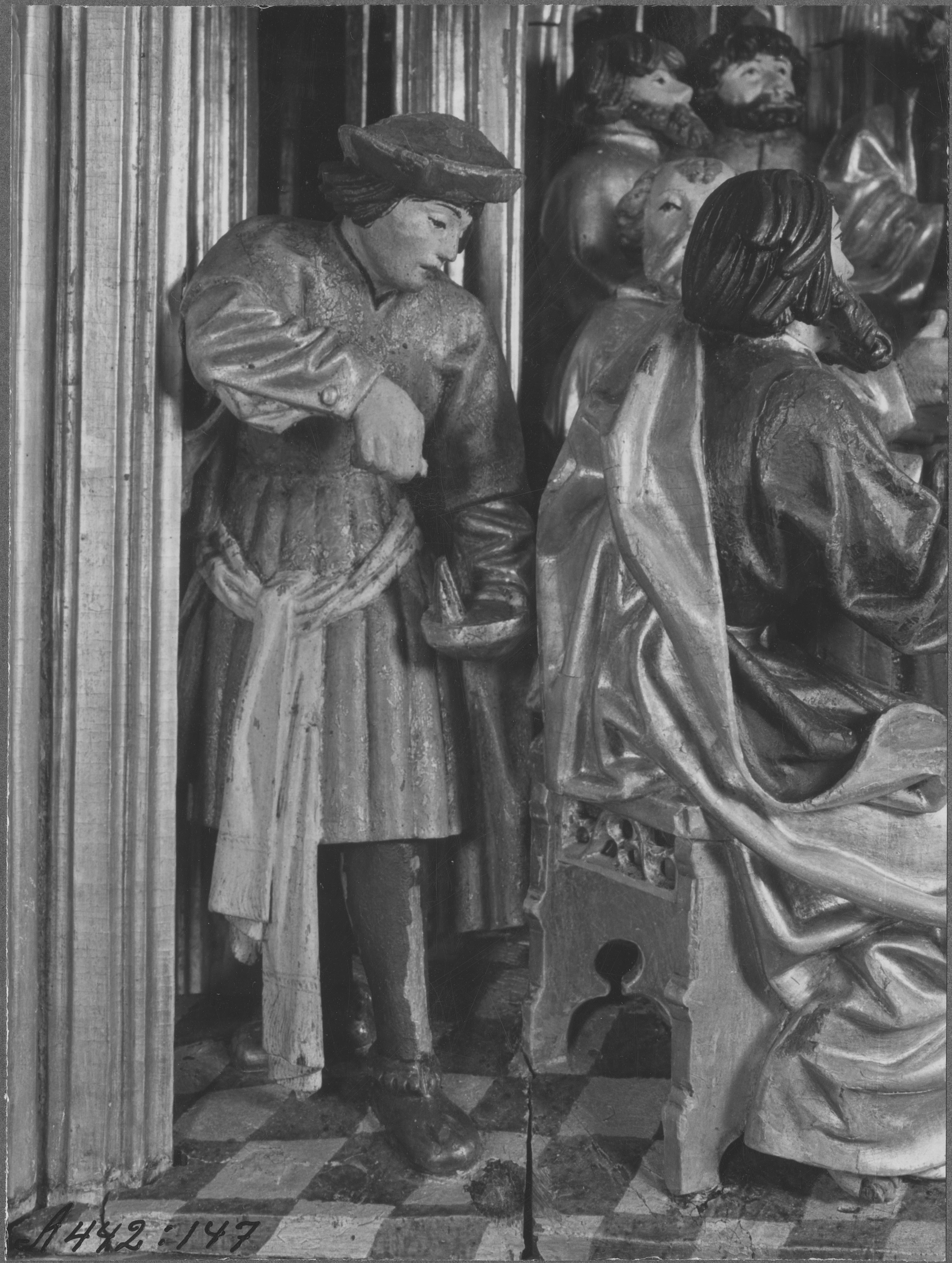 Beskrivning: Altarskåp av ek. Tillverkad i Brysselverkstad. Från 1500-talets första fjärdedel. Detalj, Nattvarden.