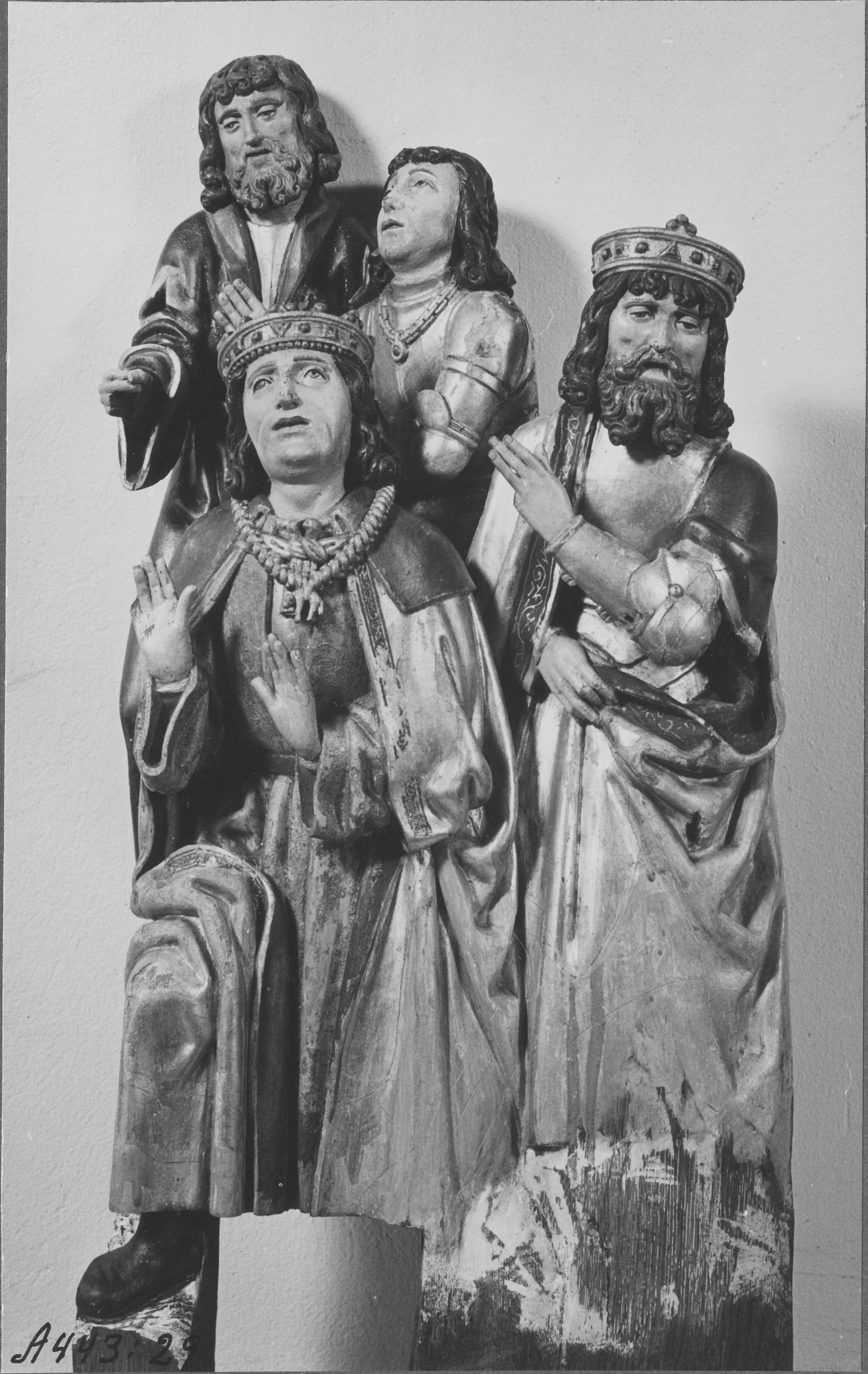 Beskrivning: Altarskåp av ek. Tillverkad i Brysselverkstad. Från 1500-talets första fjärdedel. Detalj, Marias förhärligande.