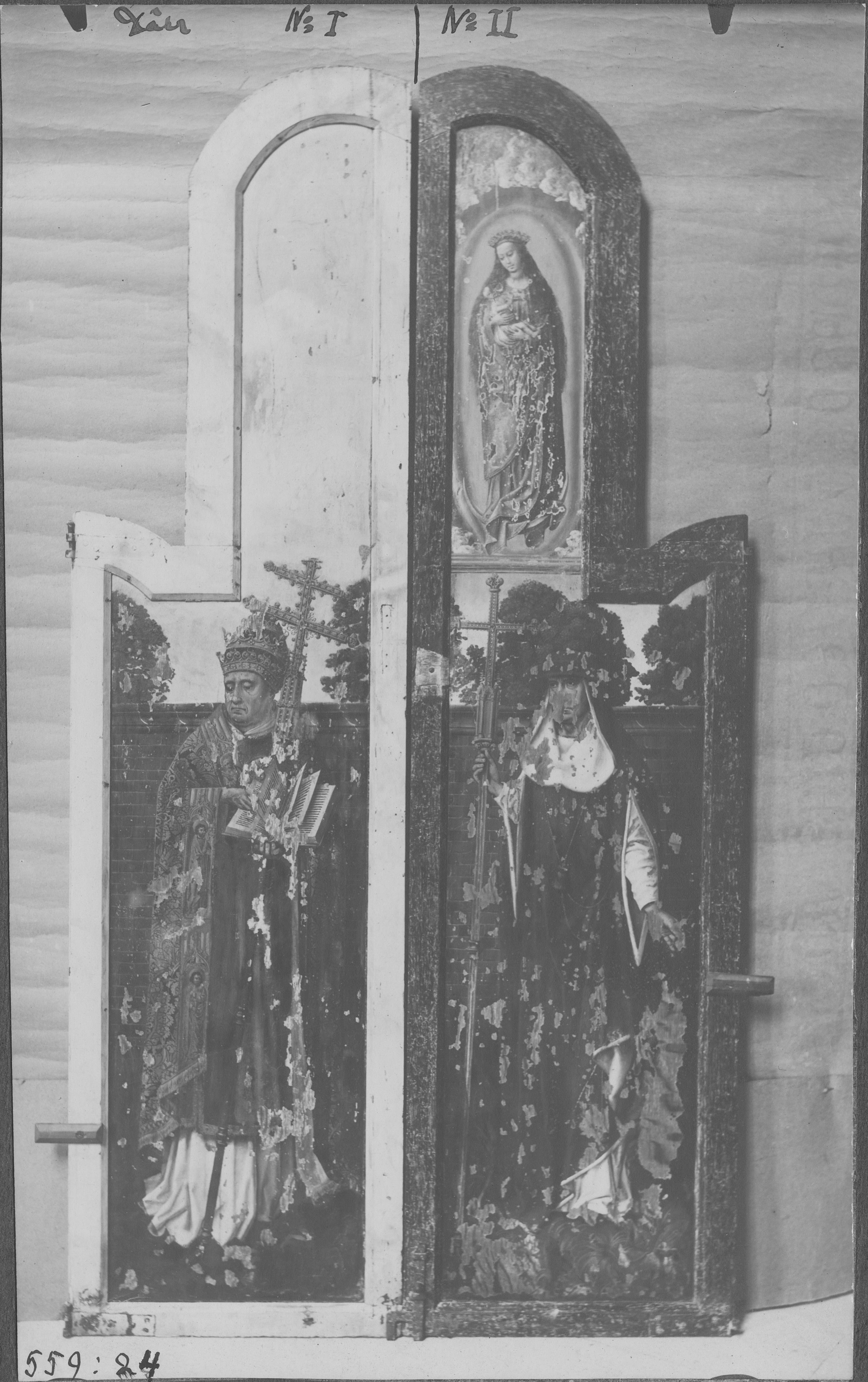 Beskrivning: Altarskåp av ek. Tillverkad i Brysselverkstad. Från 1500-talets första fjärdedel. Del av skåpets utsida. Under konservering.