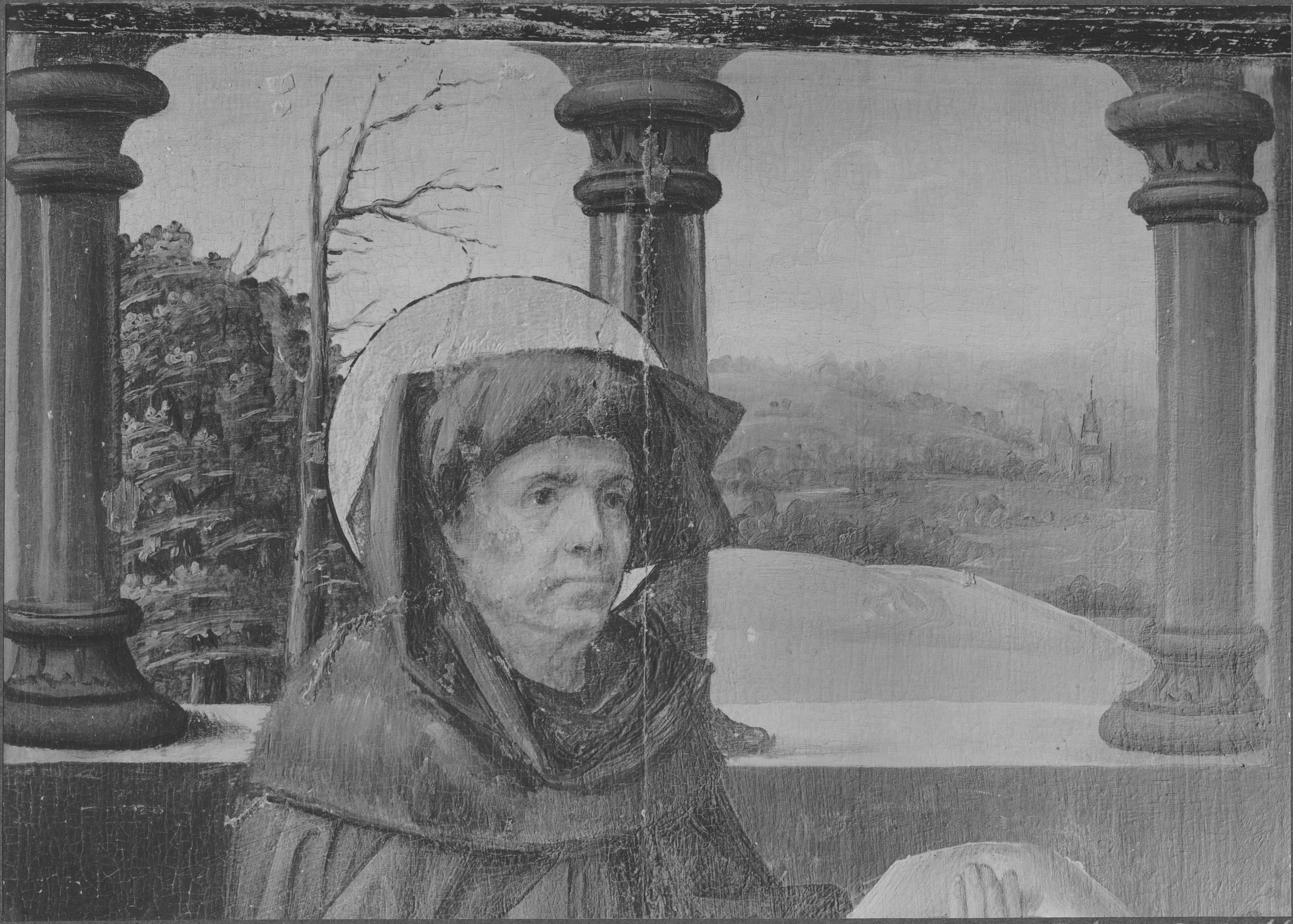 Beskrivning: Altarskåp av ek. Tillverkad i Brysselverkstad. Från 1500-talets första fjärdedel. Detalj av skåpets utsida.