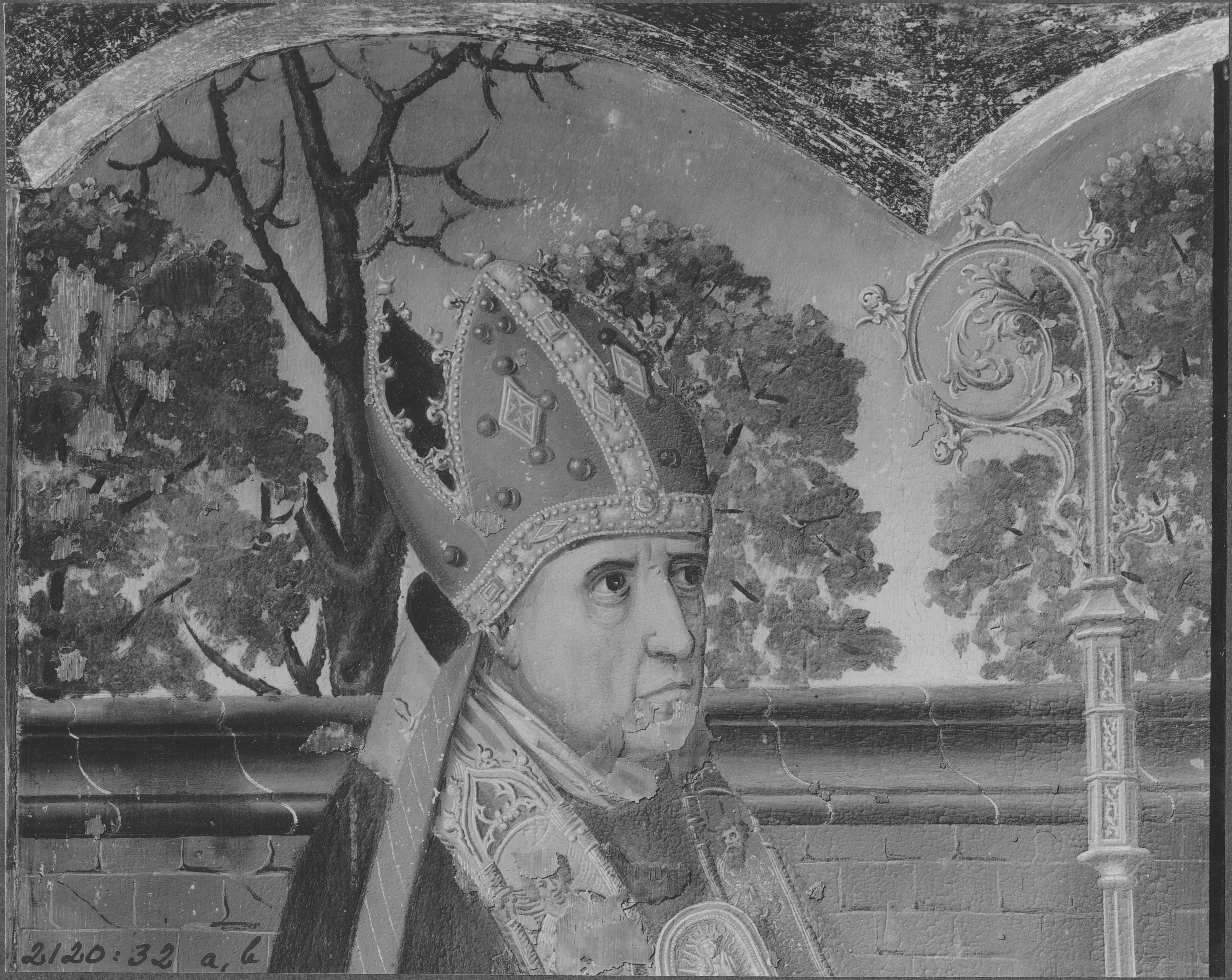 Beskrivning: Altarskåp av ek. Tillverkad i Brysselverkstad. Från 1500-talets första fjärdedel. Detalj av skåpets utsida.