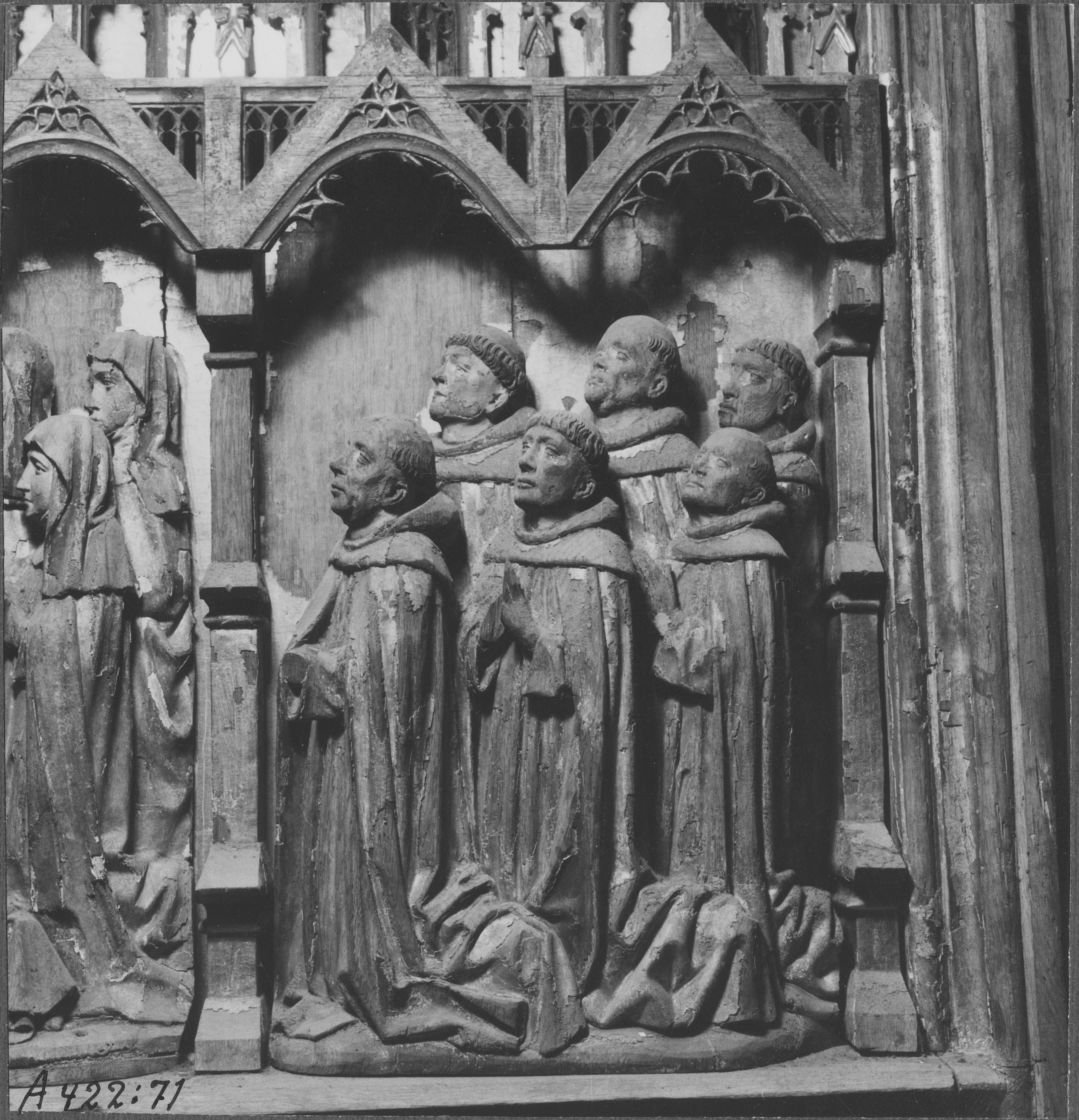 Beskrivning: Altarskåp av ek, Birgitta-altarskåpet, 1400-talets tredje fjärdedel. Detalj av corpus, munkar.
