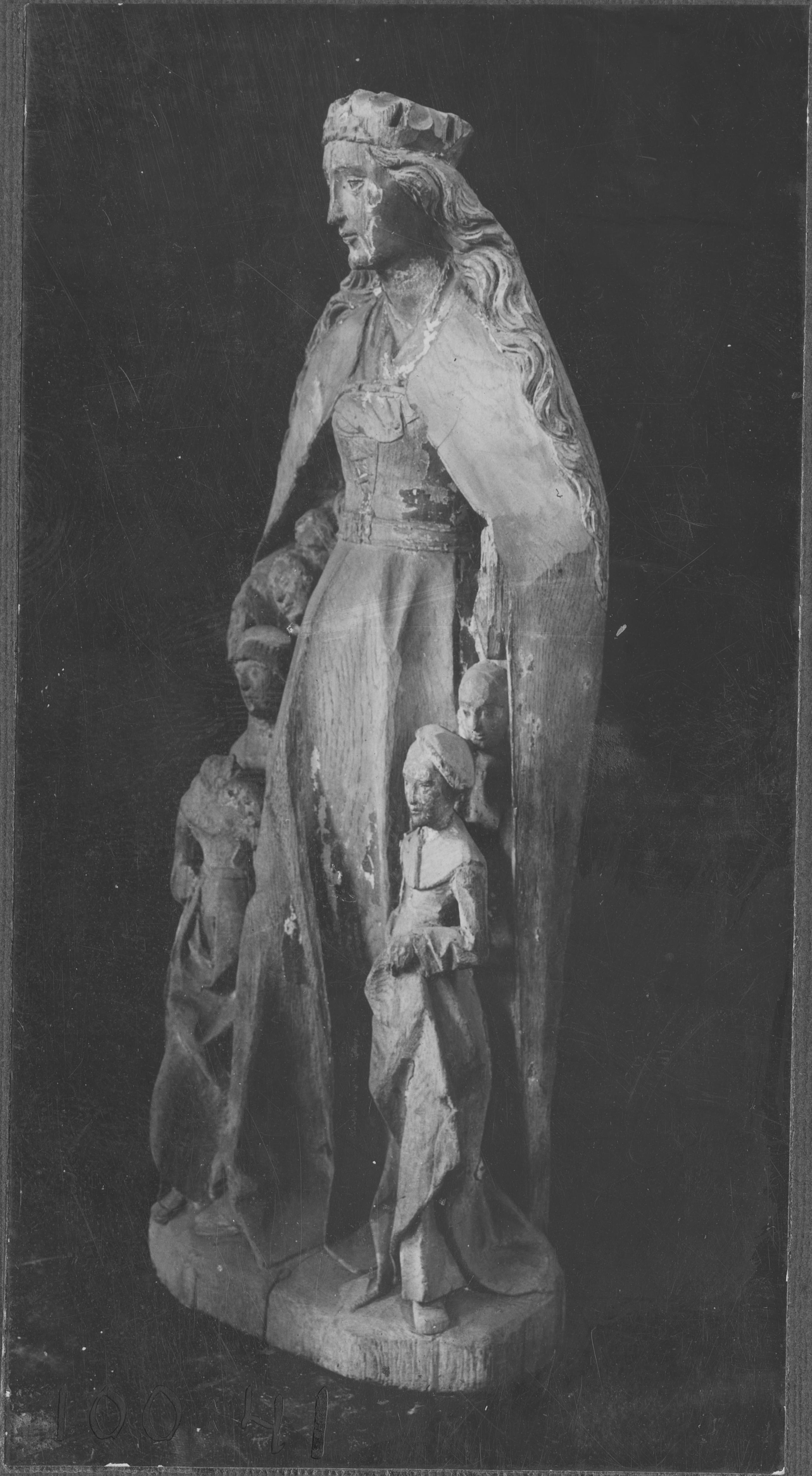 Beskrivning: Träskulptur av ek föreställande Heliga Ursula med de 11000 jungfrurna insvepta i manteln.