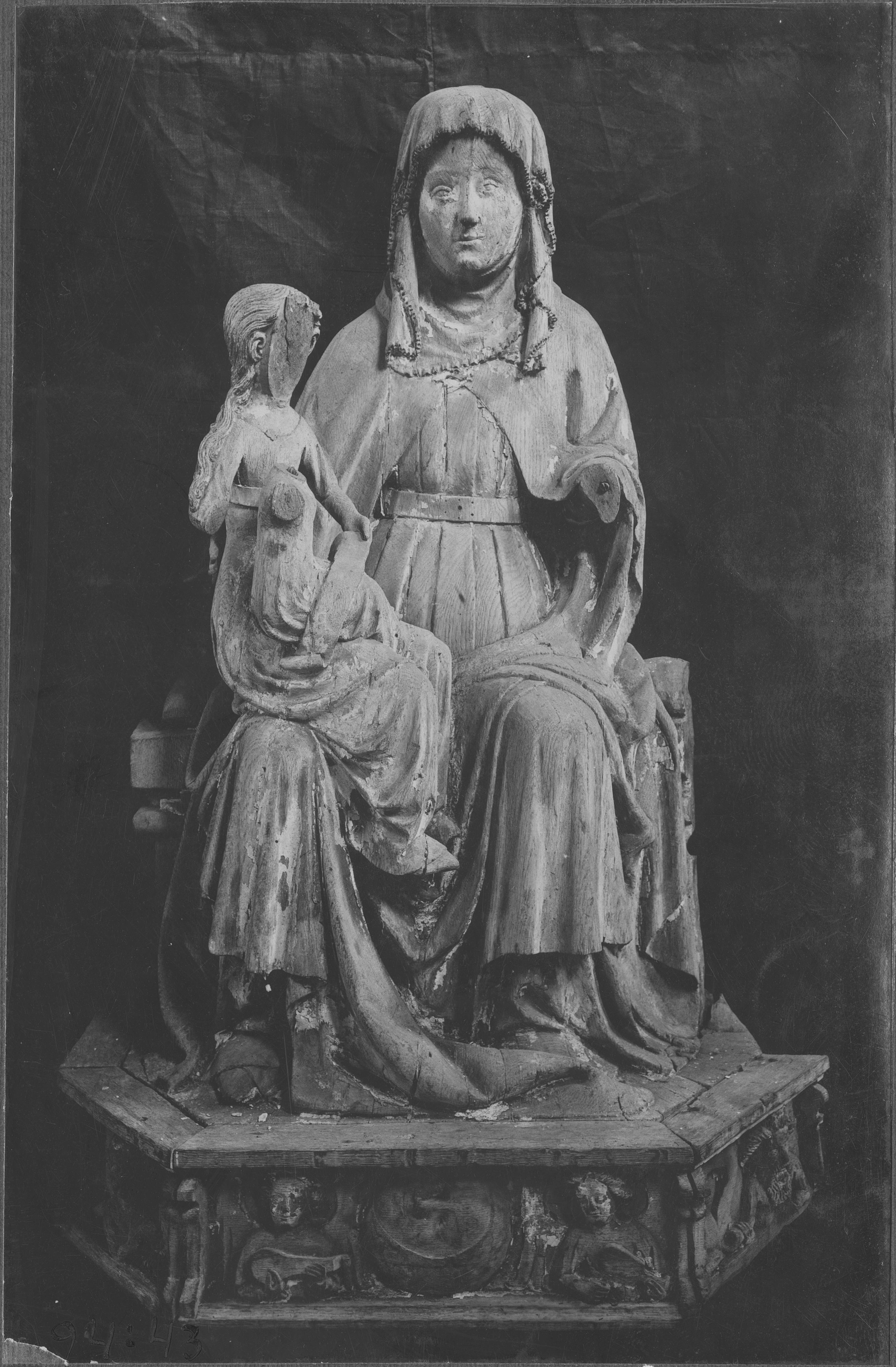 Beskrivning: Träskulptur av ek föreställande S:ta Anna med jungfru Maria i knät. På postamentet profetgestalter. 1400-talets första hälft.