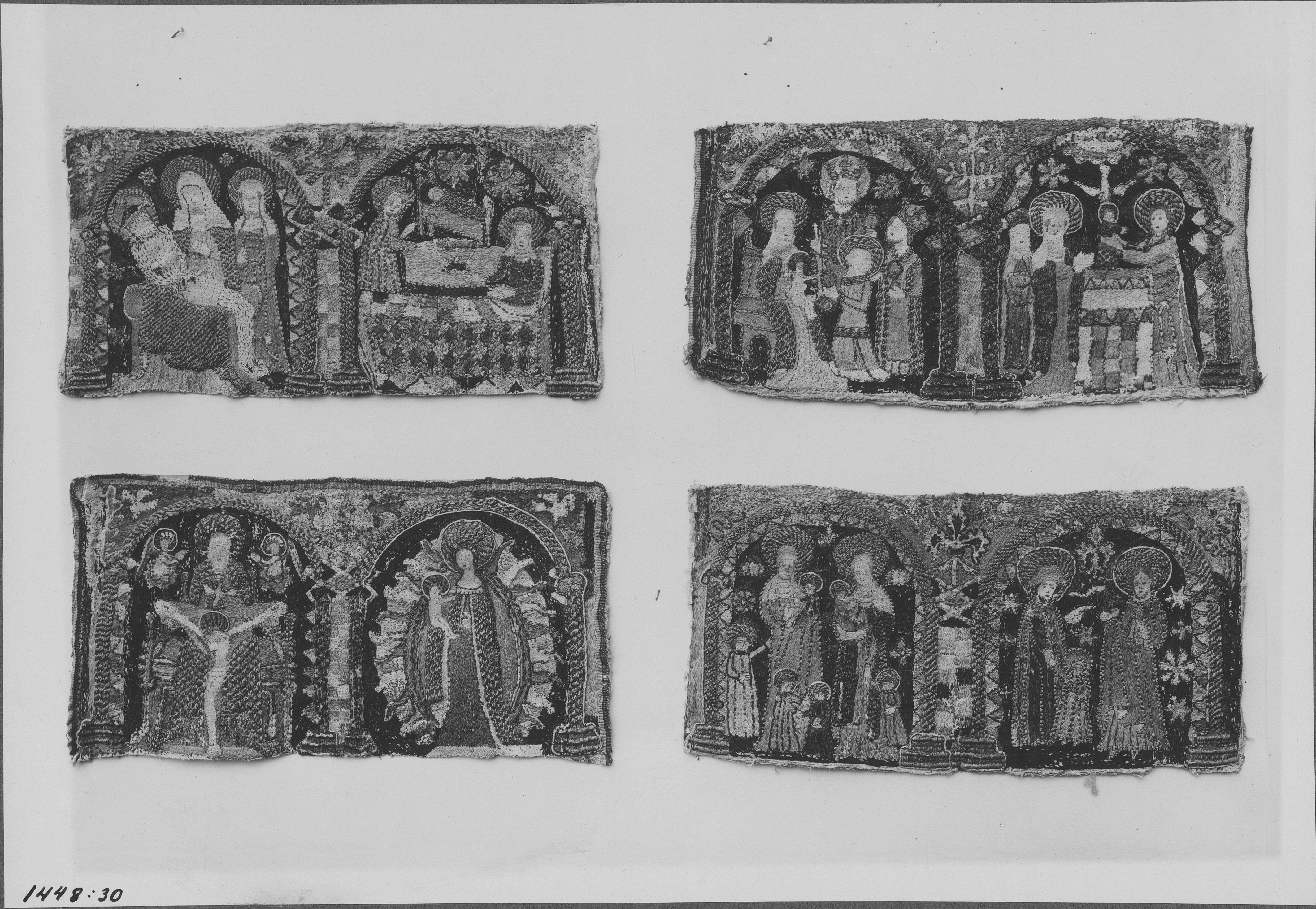 Beskrivning: Besättning till en alba. Fyra rektangulära bildfält broderade med silke och guld. Textilutställningen i Stockholm 1929.
