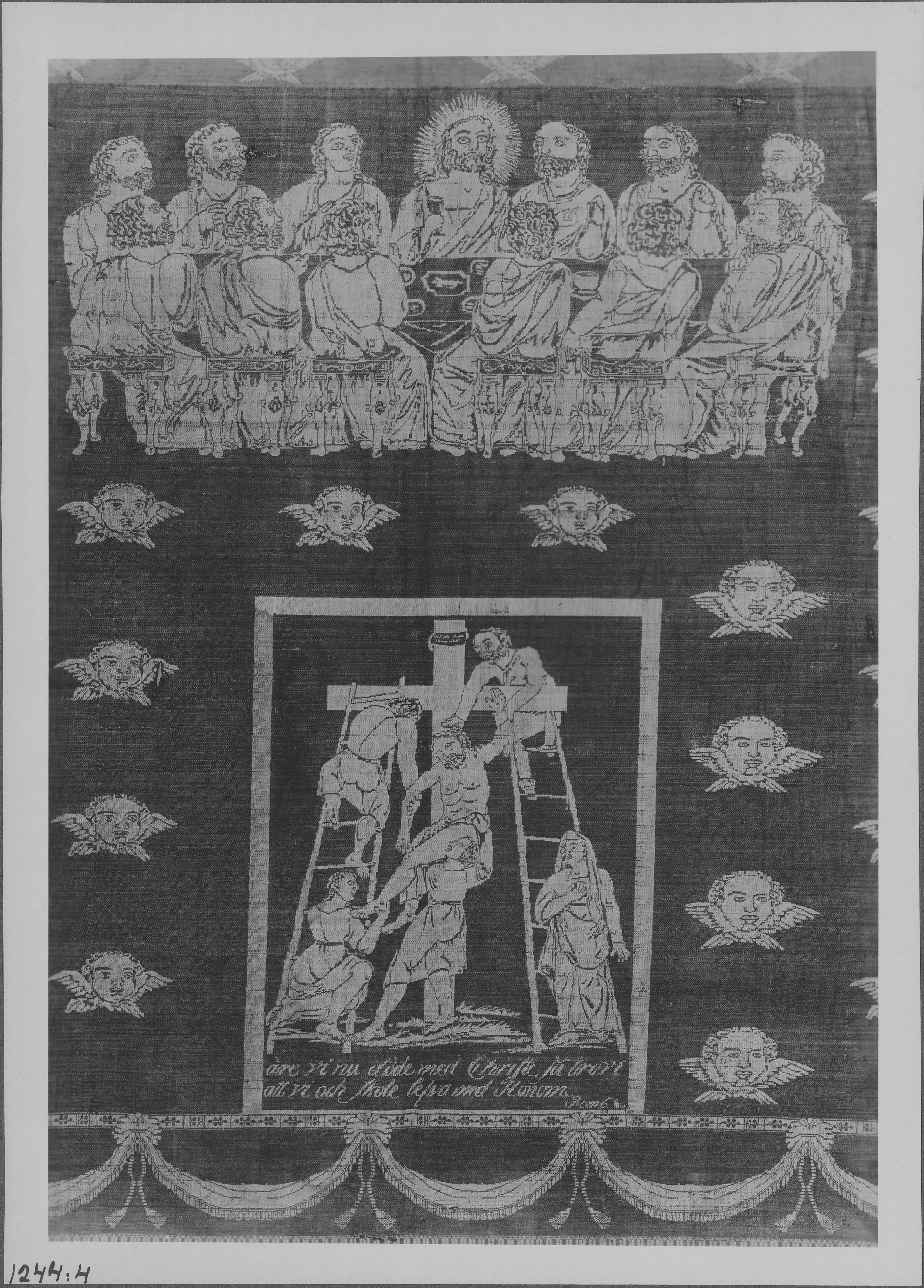 Beskrivning: Duk? Gråbrun och grå linnedamast med figurscener. I mitten nattvarden, härunder korsnedtagningen. Textilutställningen i Stockholm 1929.