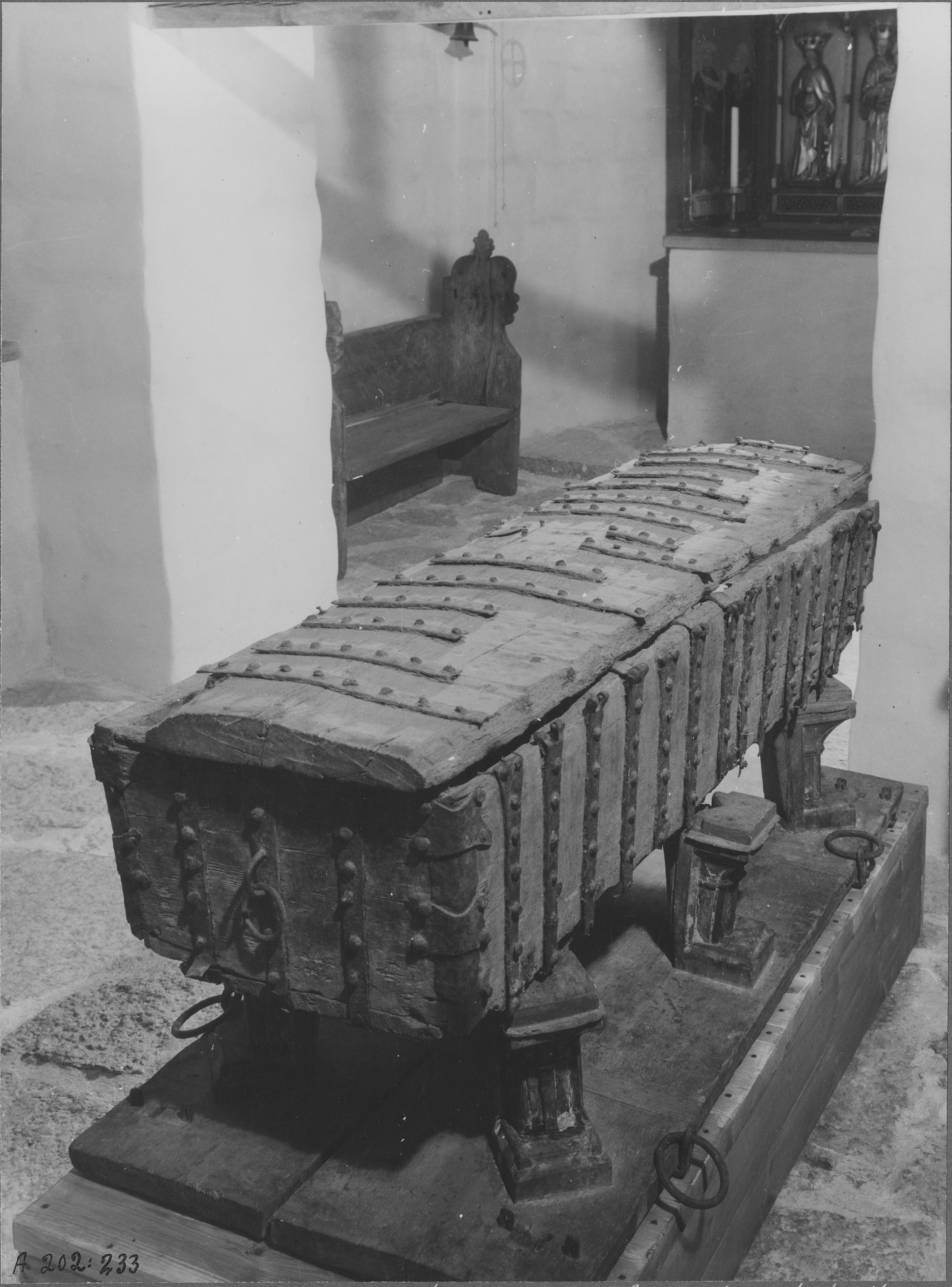 Beskrivning: Heliga Birgittas kista och bår. Av grova plankor av ek, på kistan smidda järnbeslag. Båren utgörs av bottenskiva med sex skulpterade fötter. Utställningen "Reliker och relikvarier", Statens Historiska Museum 1951.
