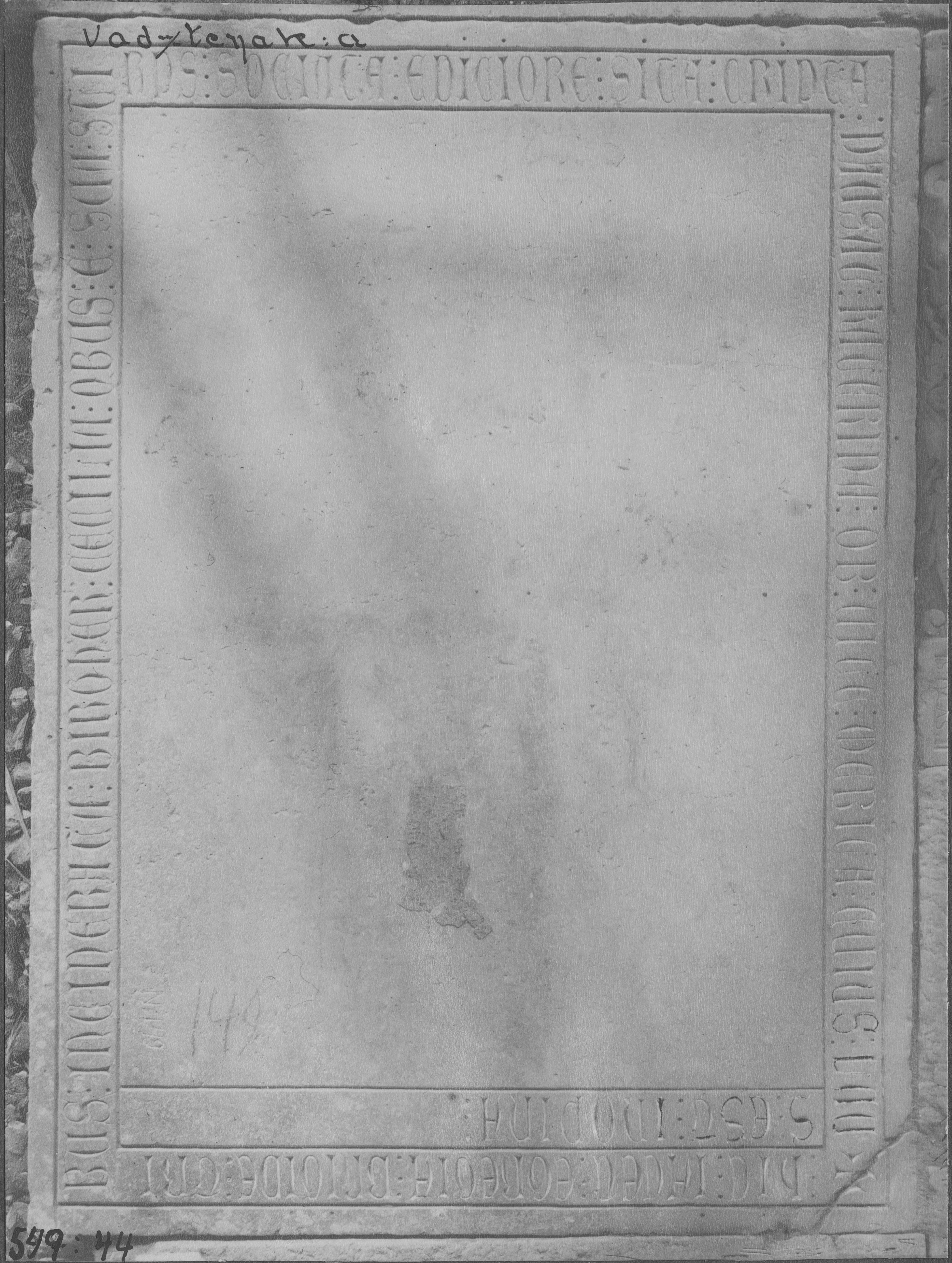 Beskrivning: Gravsten i vid kyrkans mellersta gång, nedre änden.