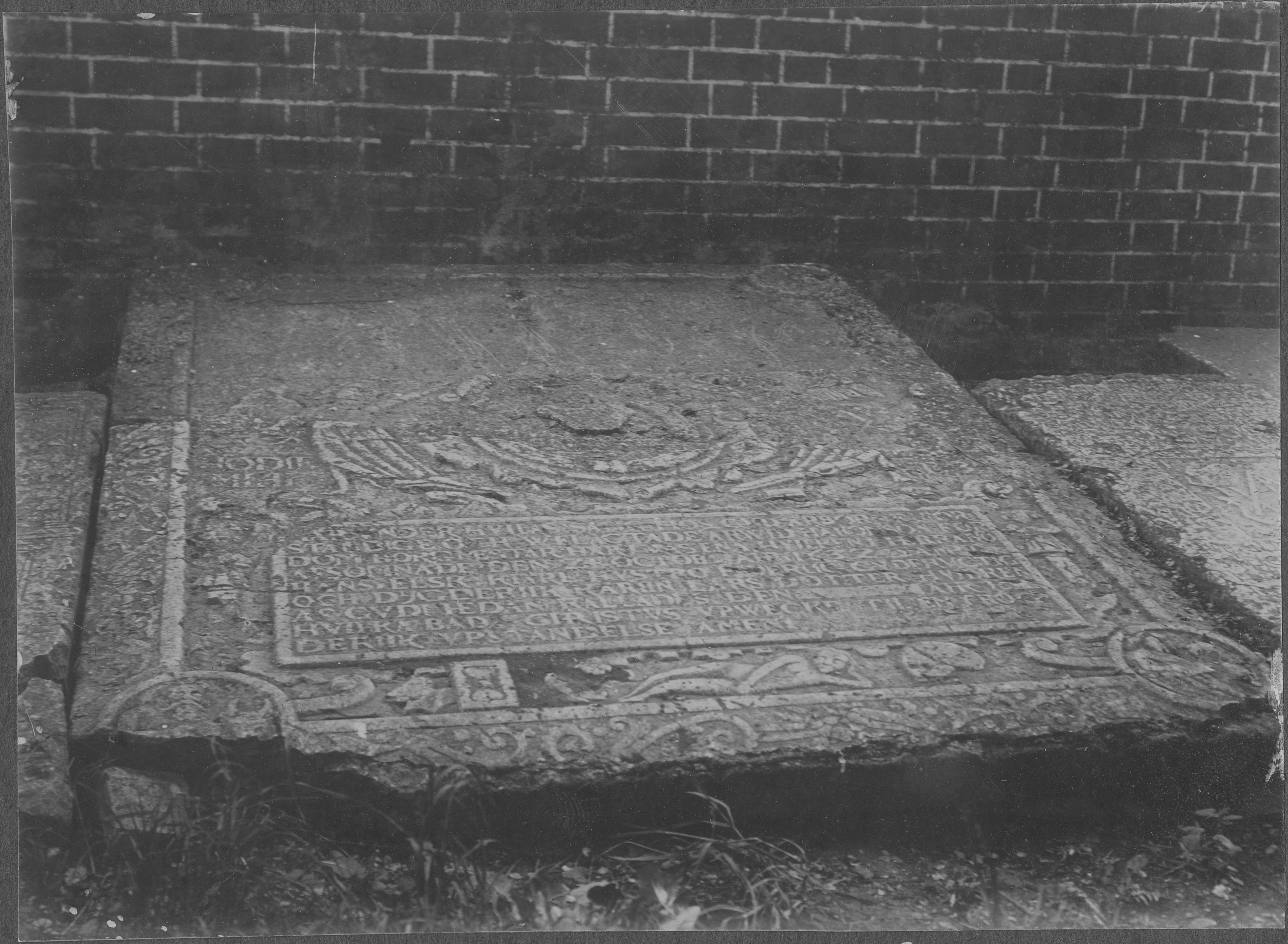 Beskrivning: Gravsten vid muren på klosterkyrkogården.