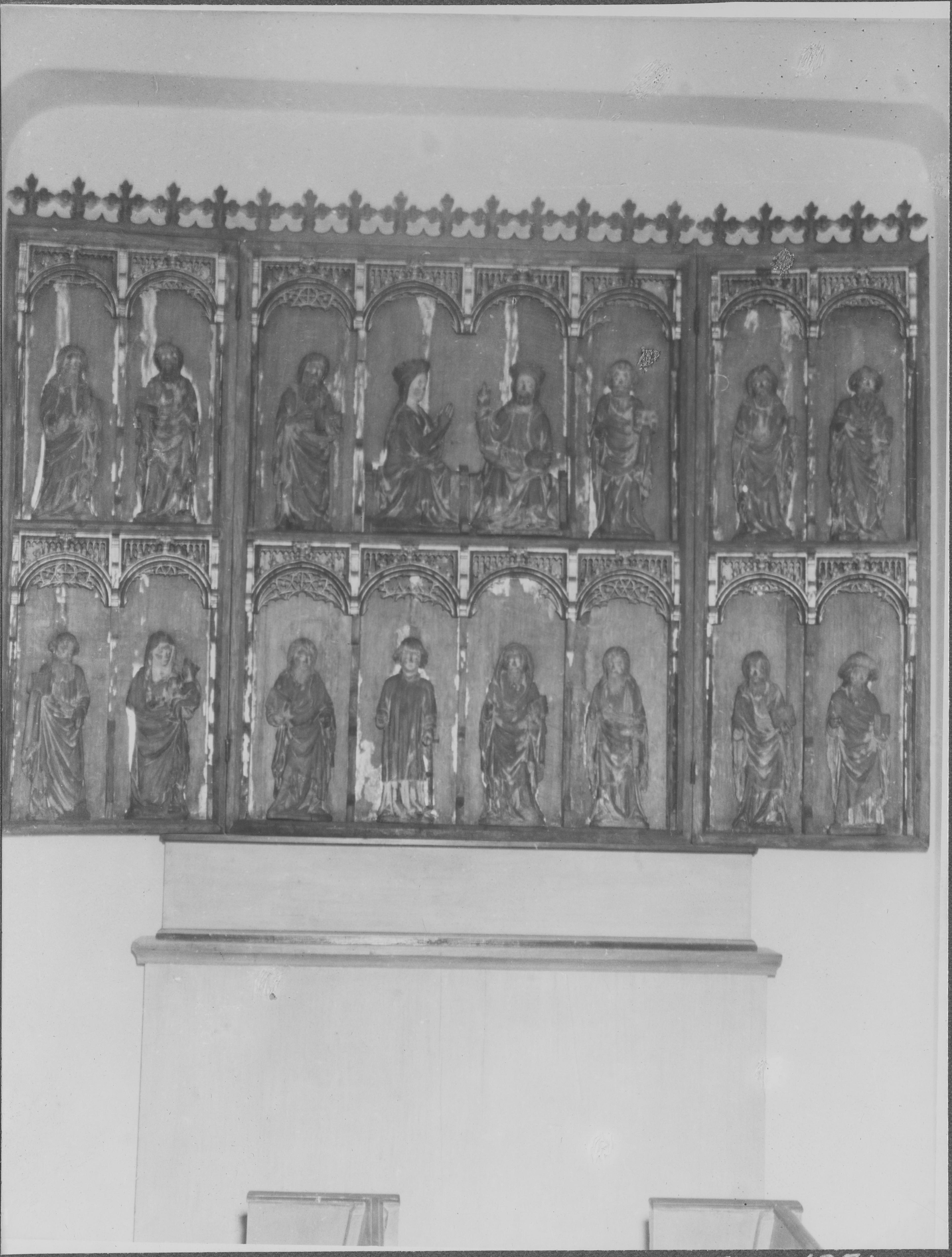 Beskrivning: Altarskåp av ek, corpus med två flygeldörrar. I corpus Marie kröning. Under och i flyglarna helgon. 1400-tal, nordtyskt arbete. Efter konservering.