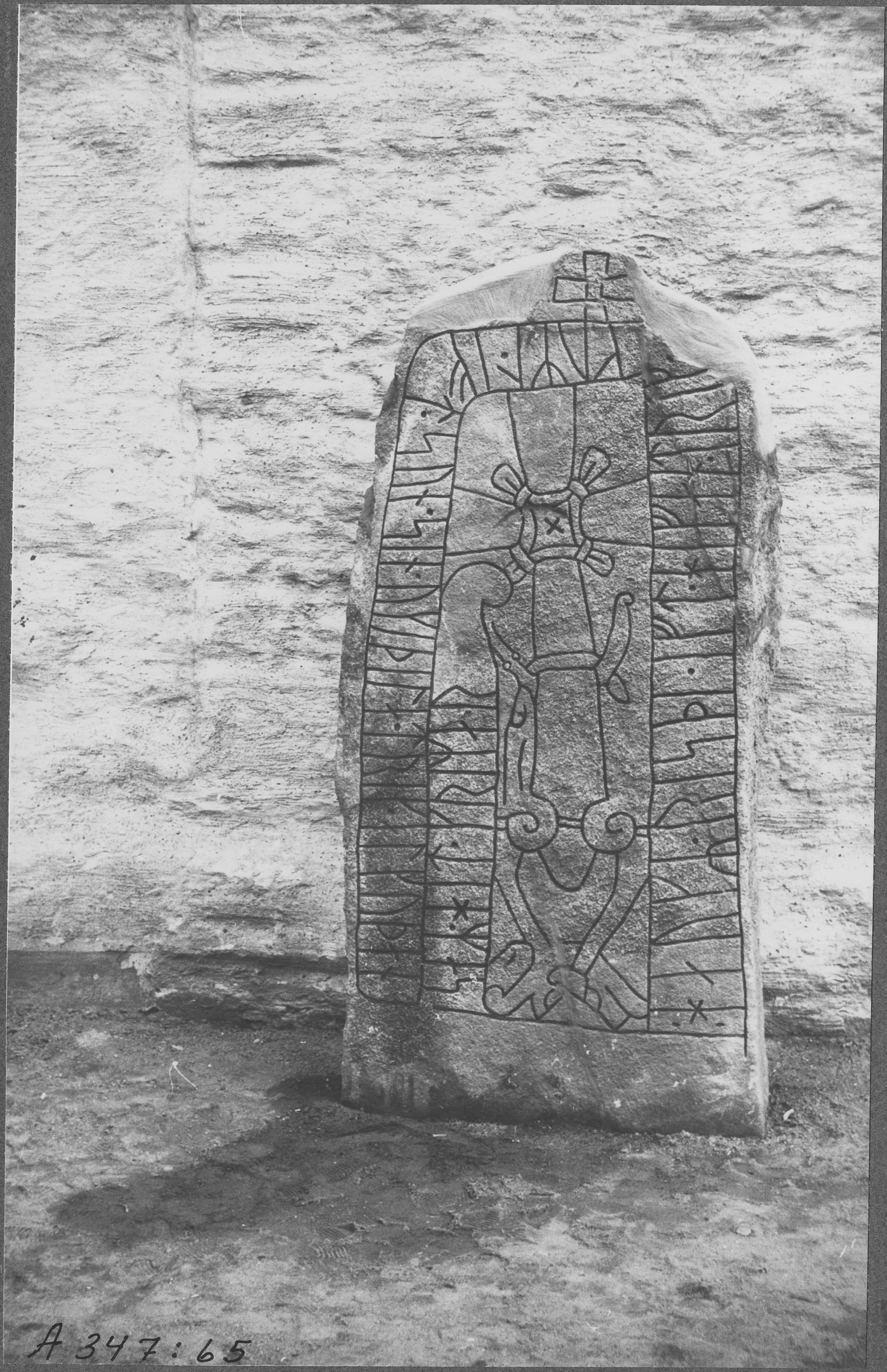 Beskrivning: ÖgNf1962 Viby. Runsten funnen under tornets norra mur. Inskriften lyder: "Hök reste efter duglig ung man minnesmärke, efter sin son .. , en mycket god ung man. Han hette Grimar".