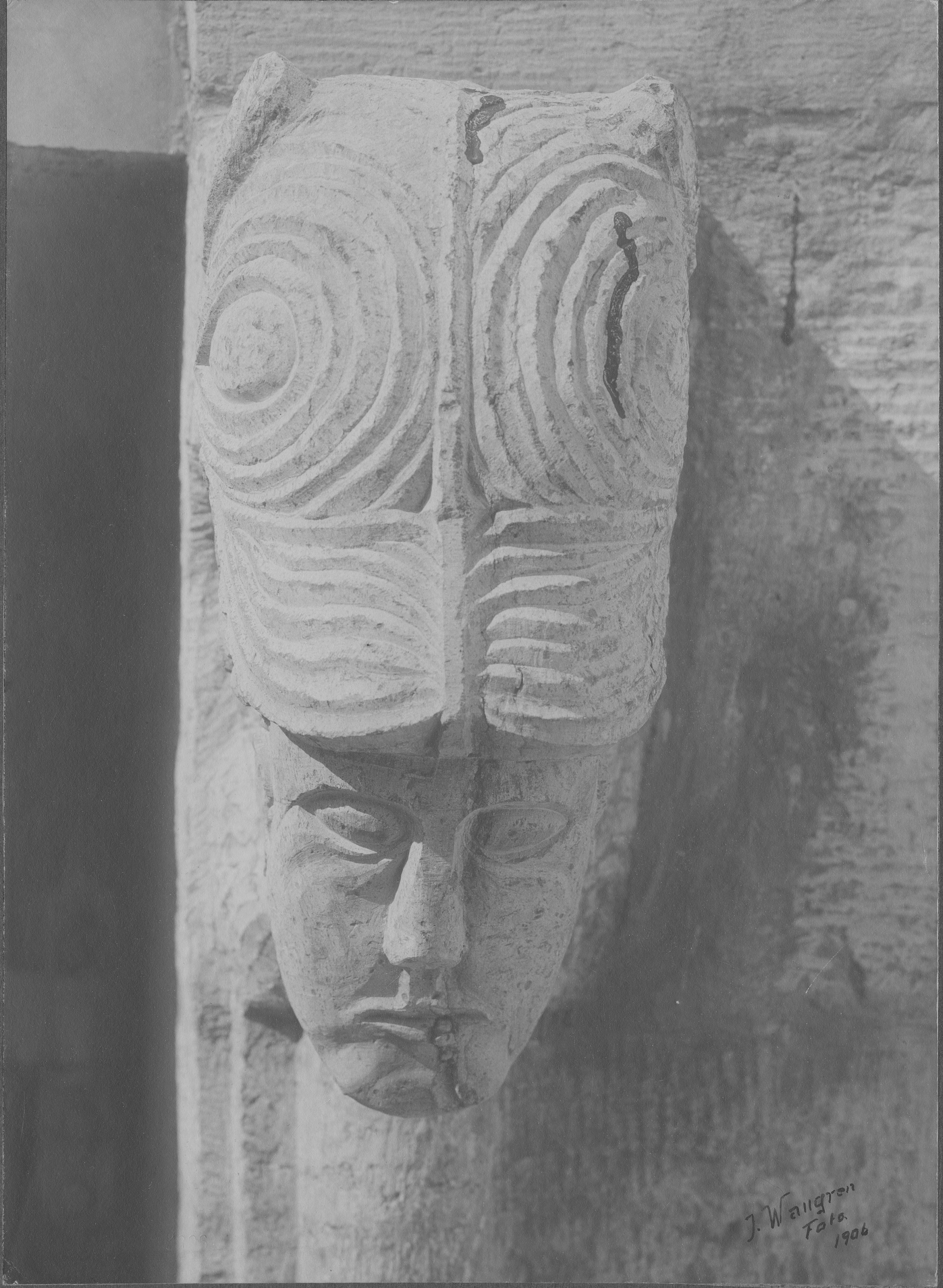 Beskrivning: Detalj av västportalen till södra tvärskeppet. Djurhuvud som gapar över ett människohuvud.