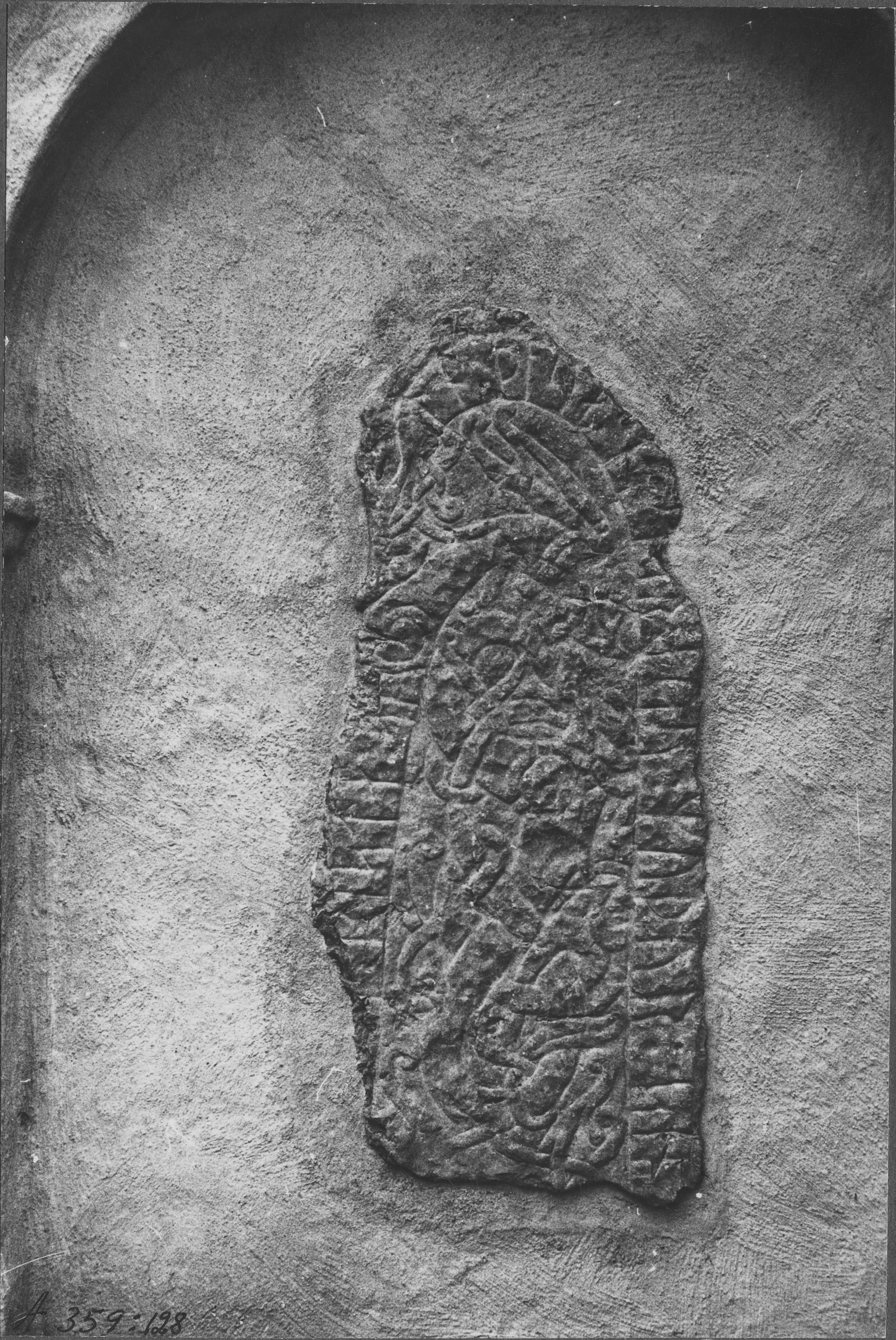 Beskrivning: Detalj av östportalen till södra tvärskeppet, med inmurad runsten