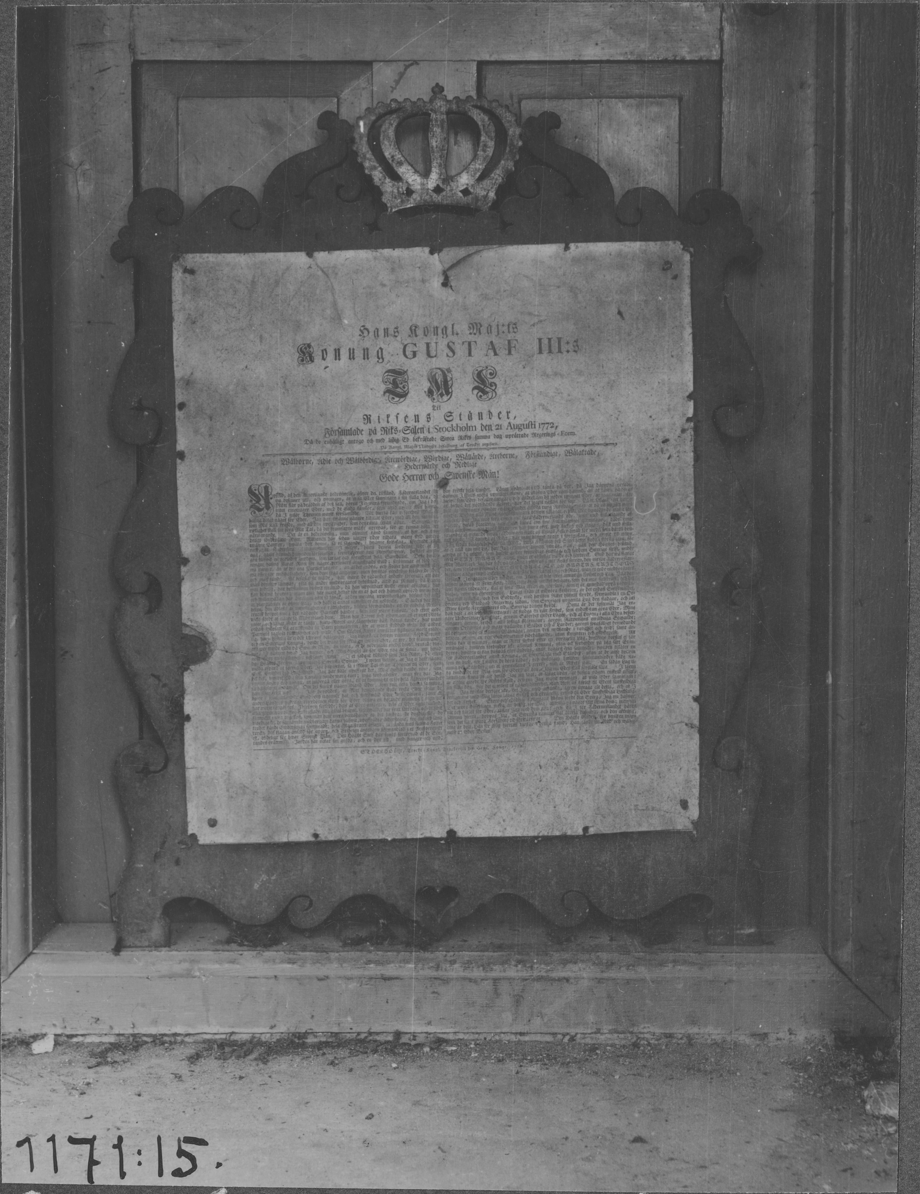Beskrivning: Gustav III:s tal 1772, på svart träram med förgylld krona. Från Snabbinventeringen 1920.