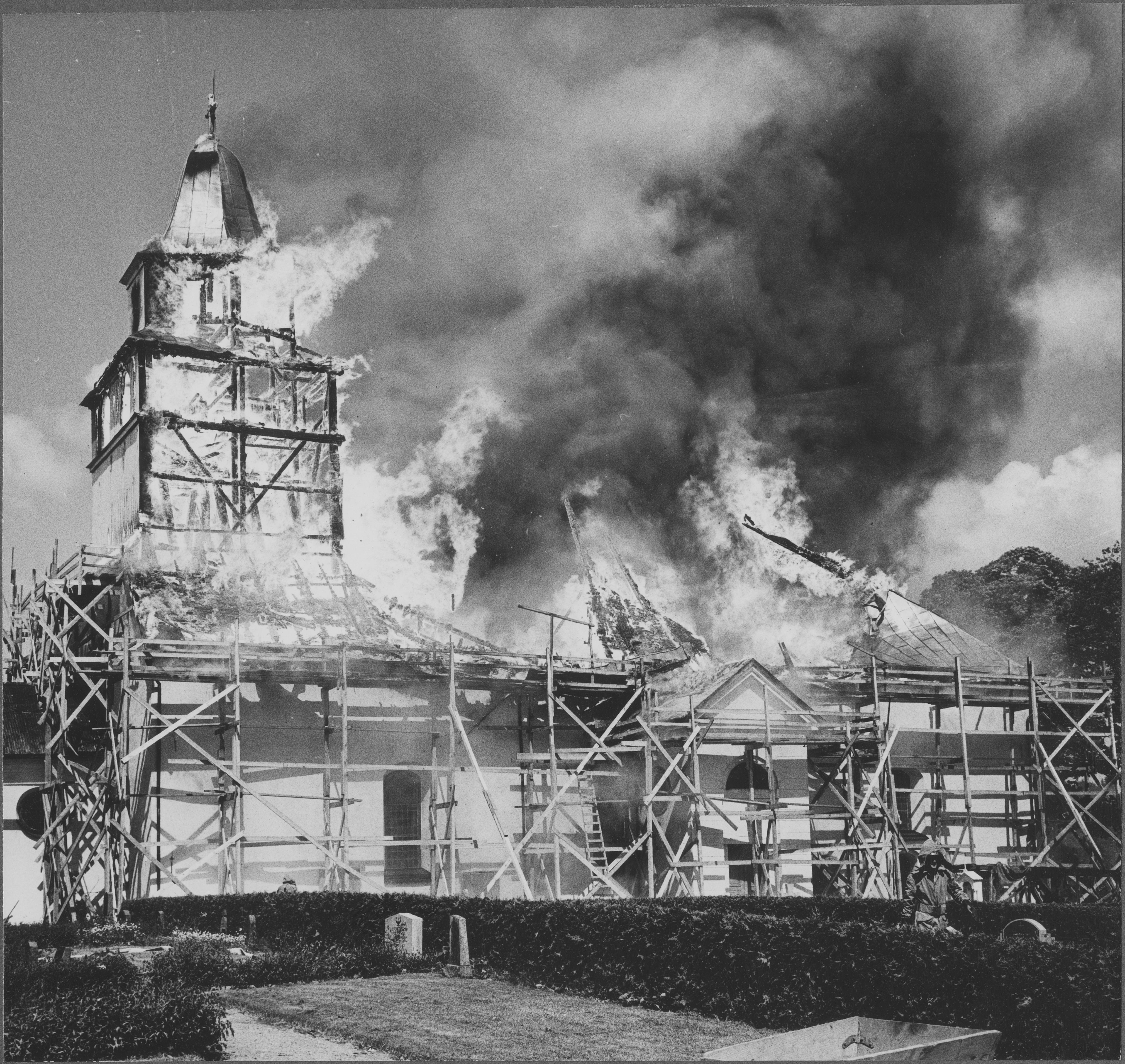 Beskrivning: Branden 21 juni 1961. Kyrkan från söder.