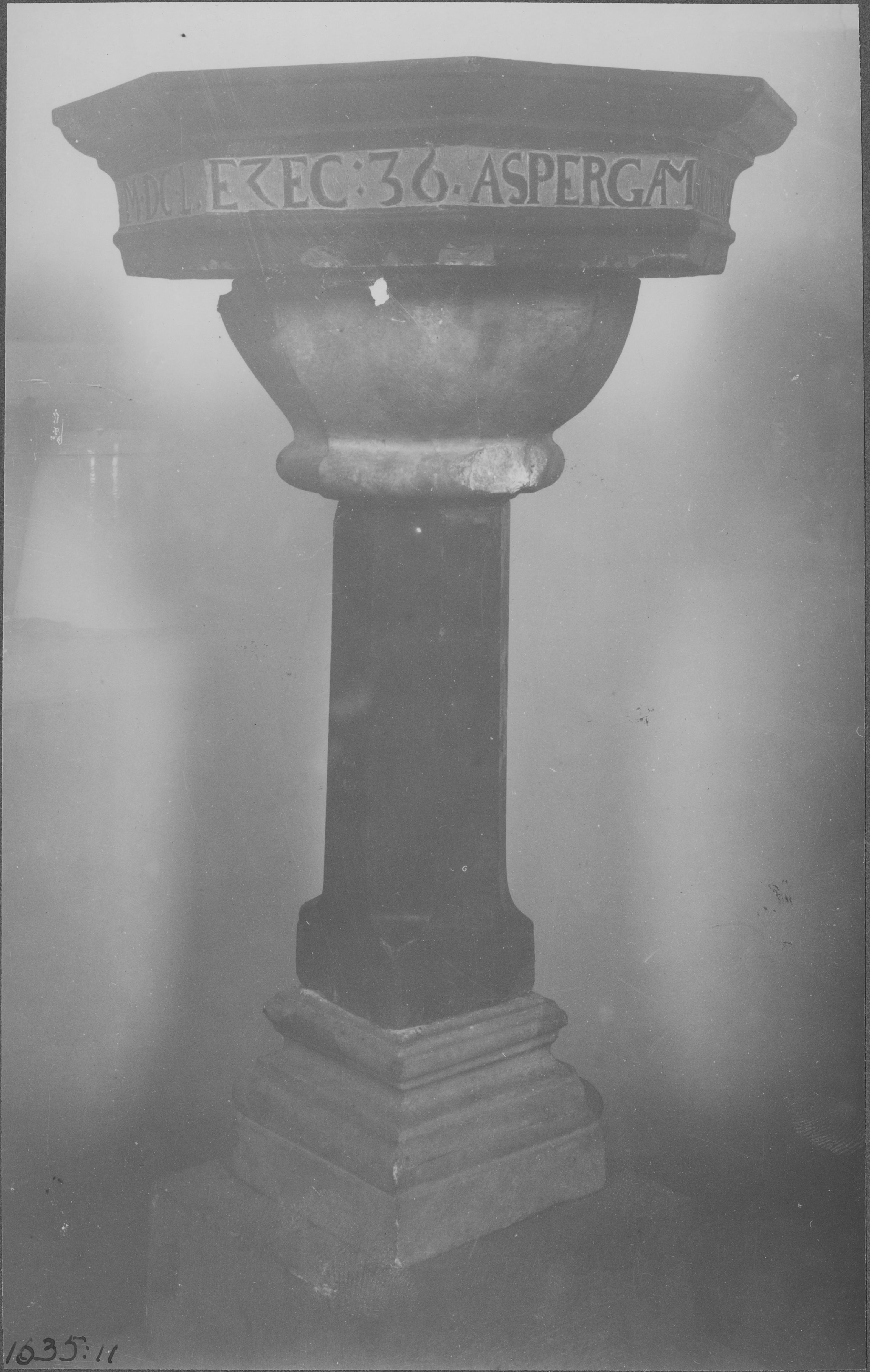 Beskrivning: Dopfunt av kalksten och alabaster, daterad 1650, av Börje Eriksson i Bäck. Från Snabbinventeringen 1921.