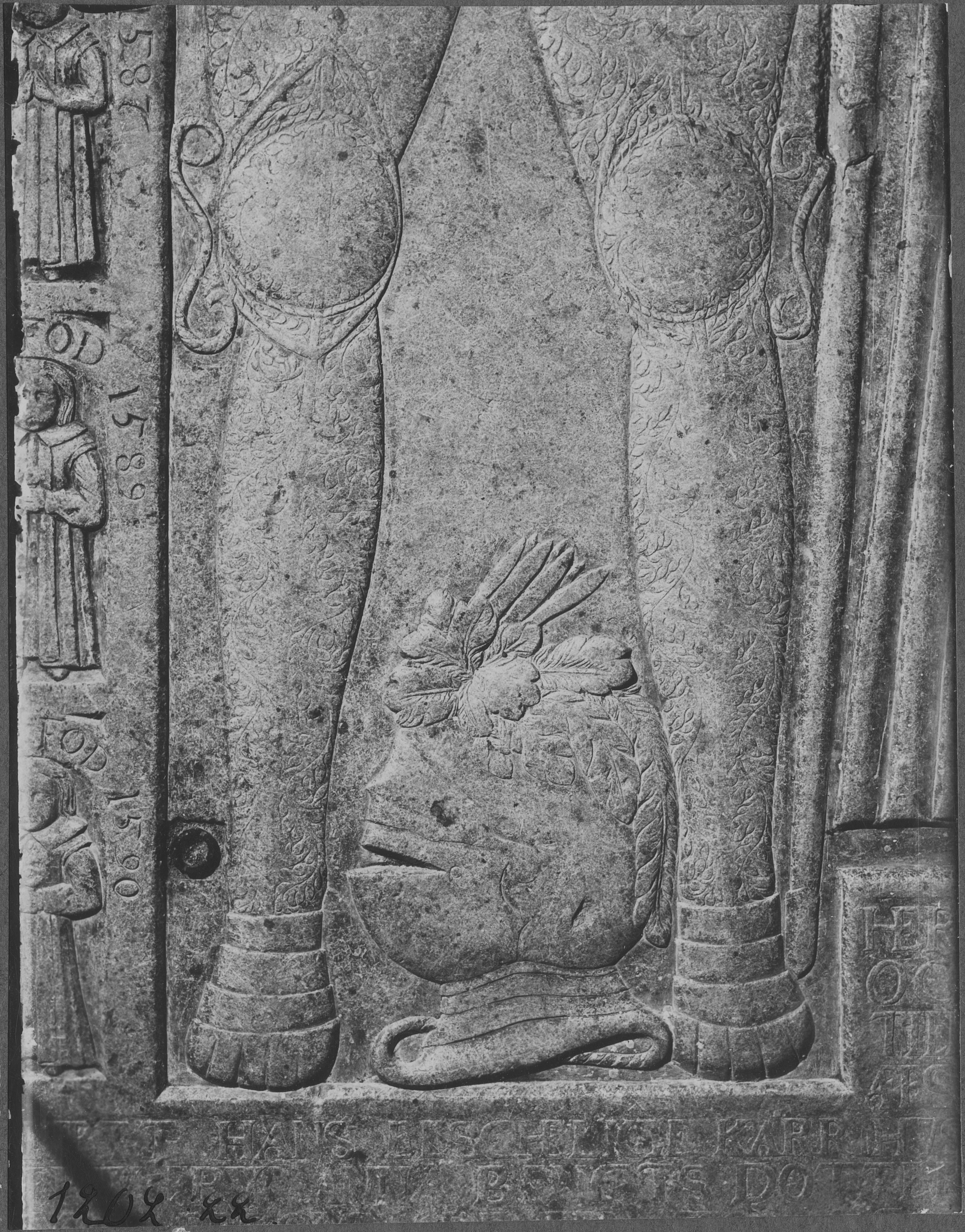 Beskrivning: Detalj av gravsten över Nils Nilsson Natt och Dag (d 1613) och Anna Bengtsdotter (d 1603).