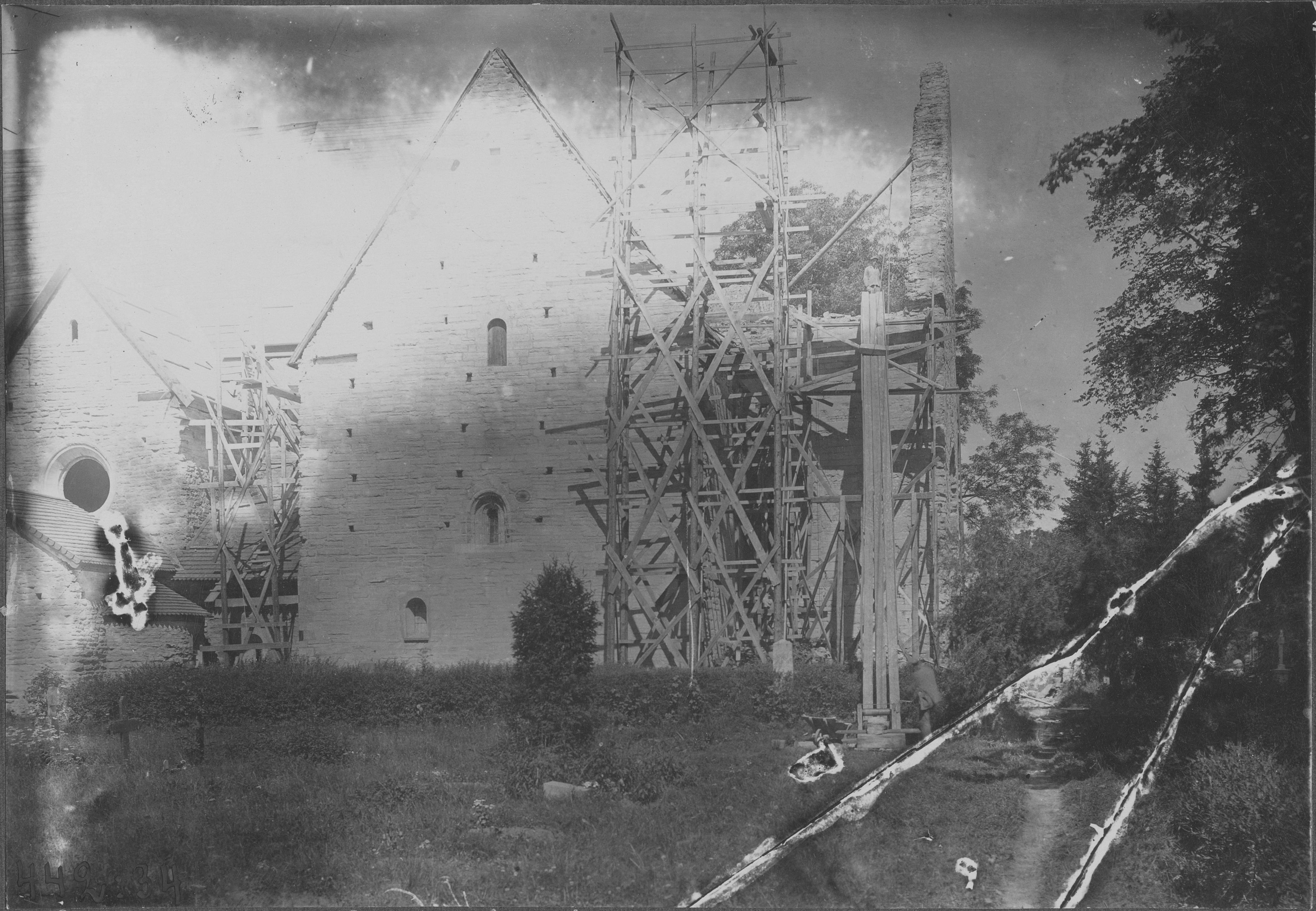Beskrivning: Kyrkan från söder, under pågående restaurering.