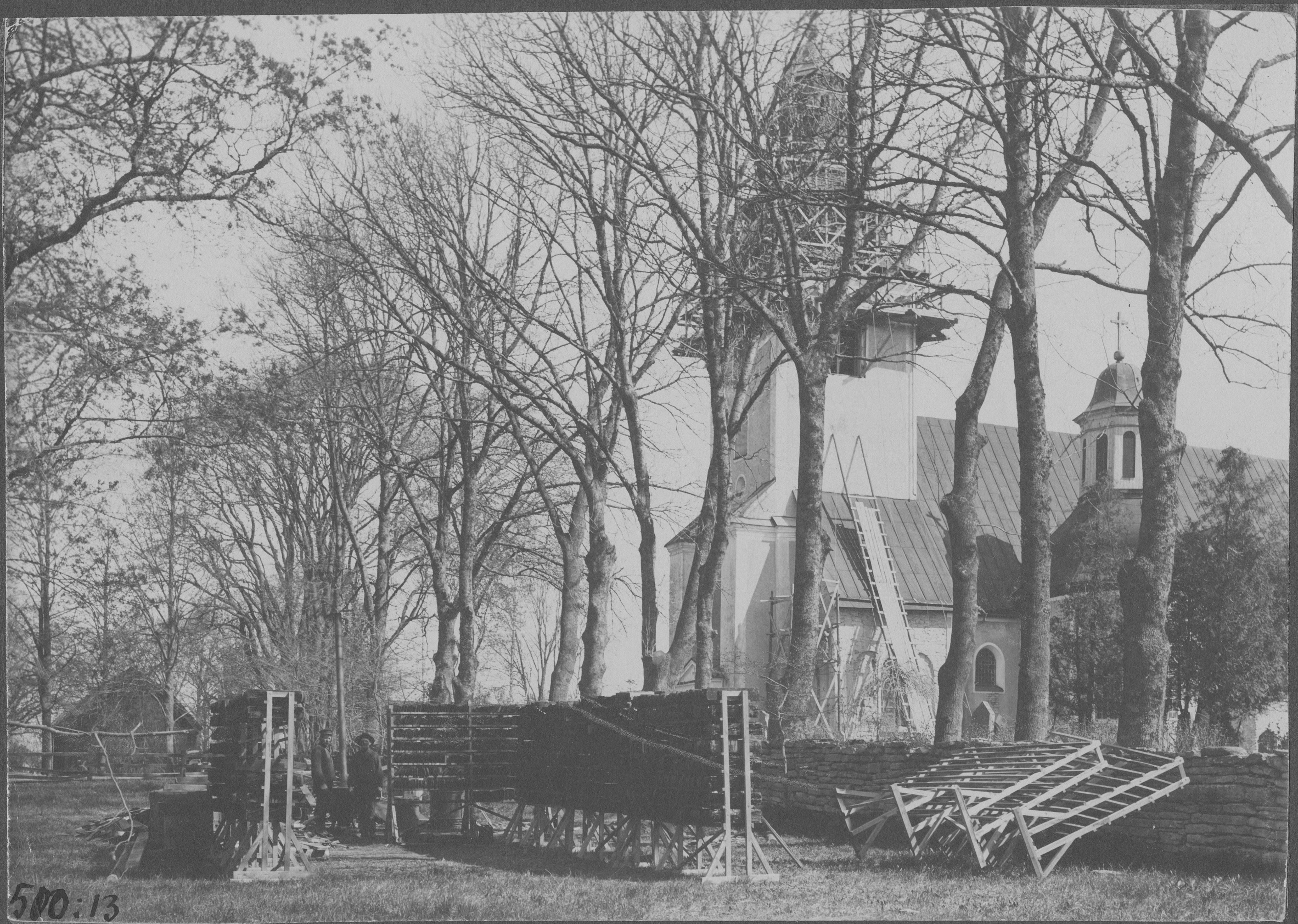 Beskrivning: Kyrkan från sydväst. Tjärkokning och torkning av takspån till vänster i bild.