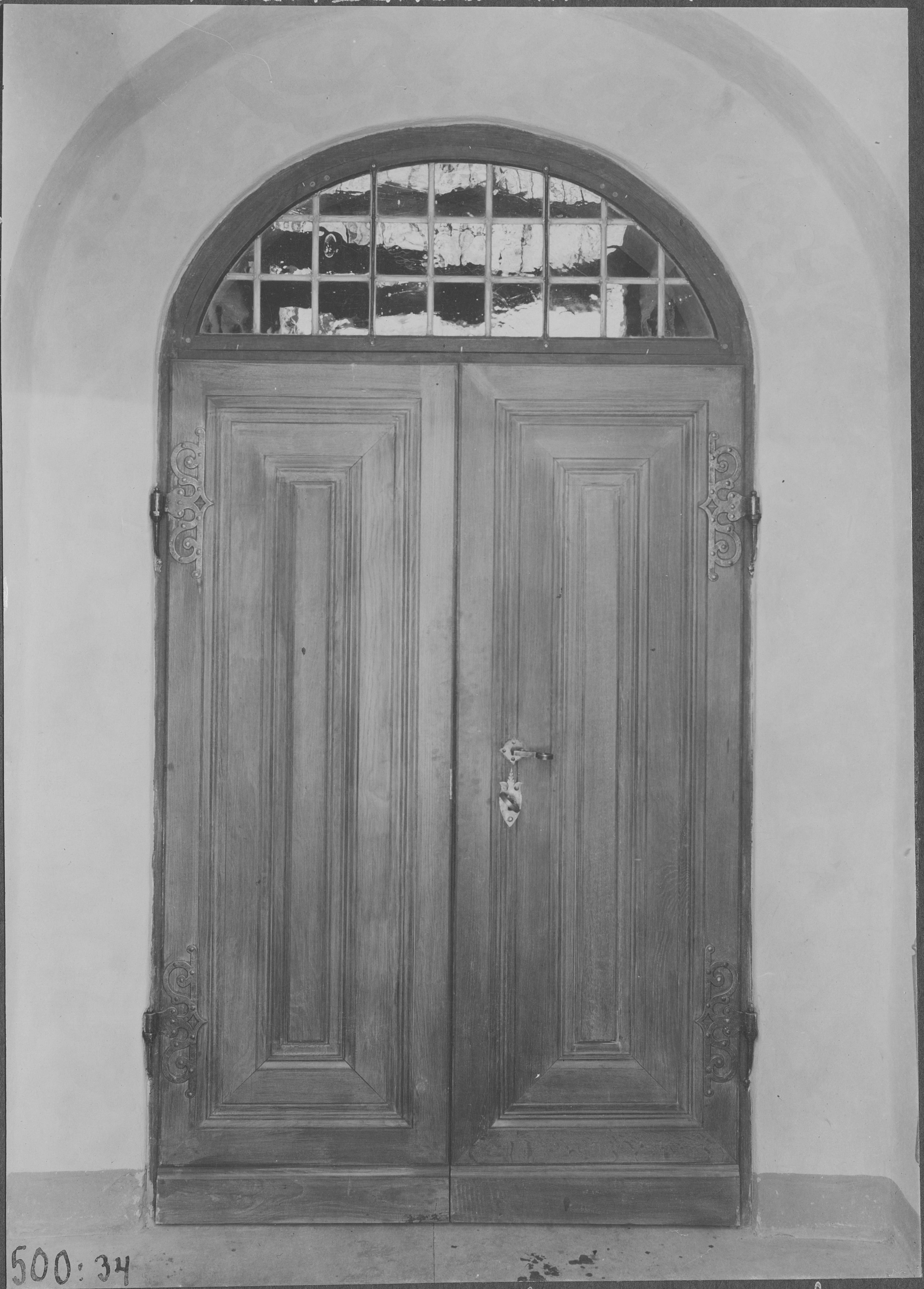 Beskrivning: Vapenhuset, dörr in till kyrkan. Efter restaurering. Fotot troligen från 1917.