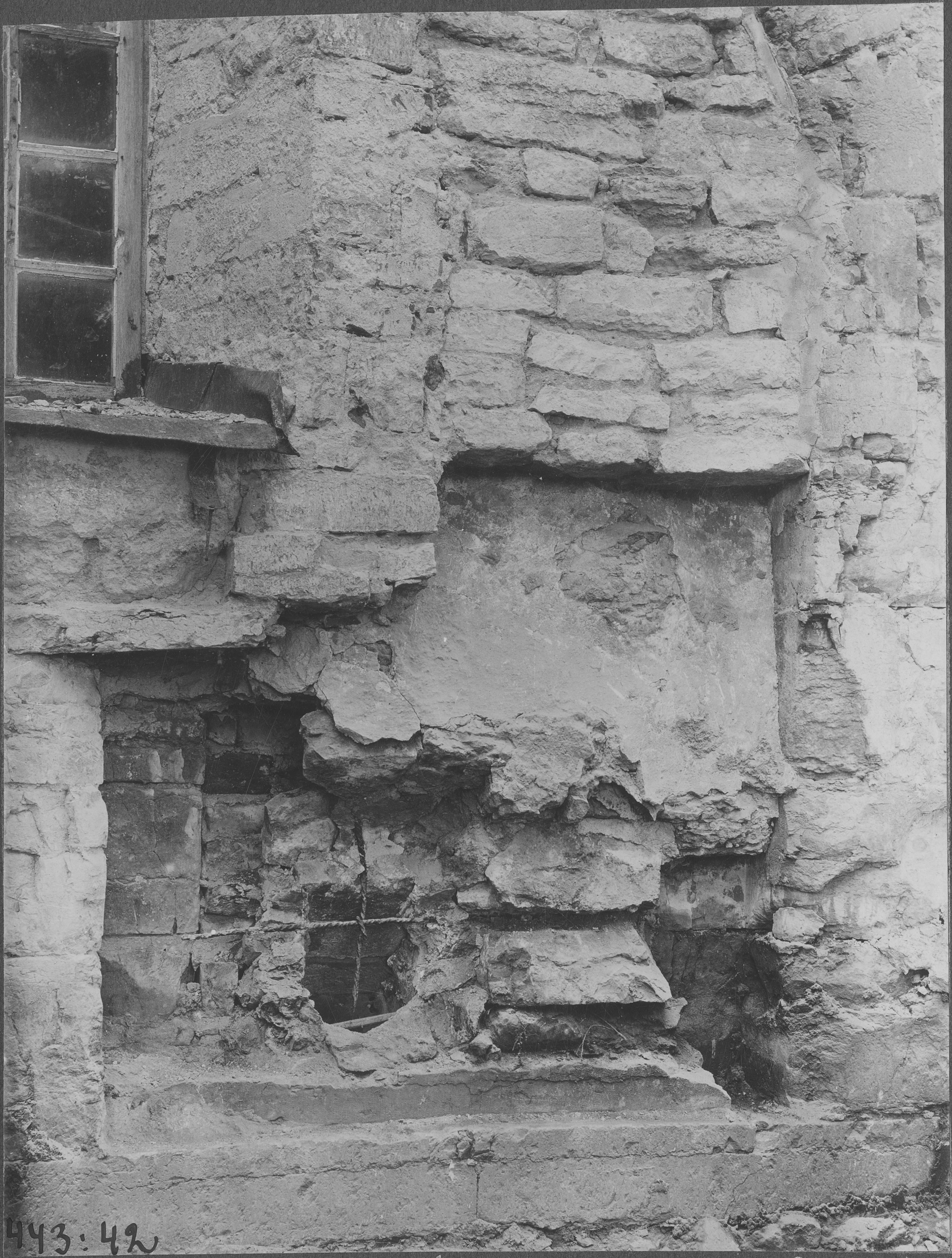 Beskrivning: Detalj av norra korarmen - spår av port på östra sidan.