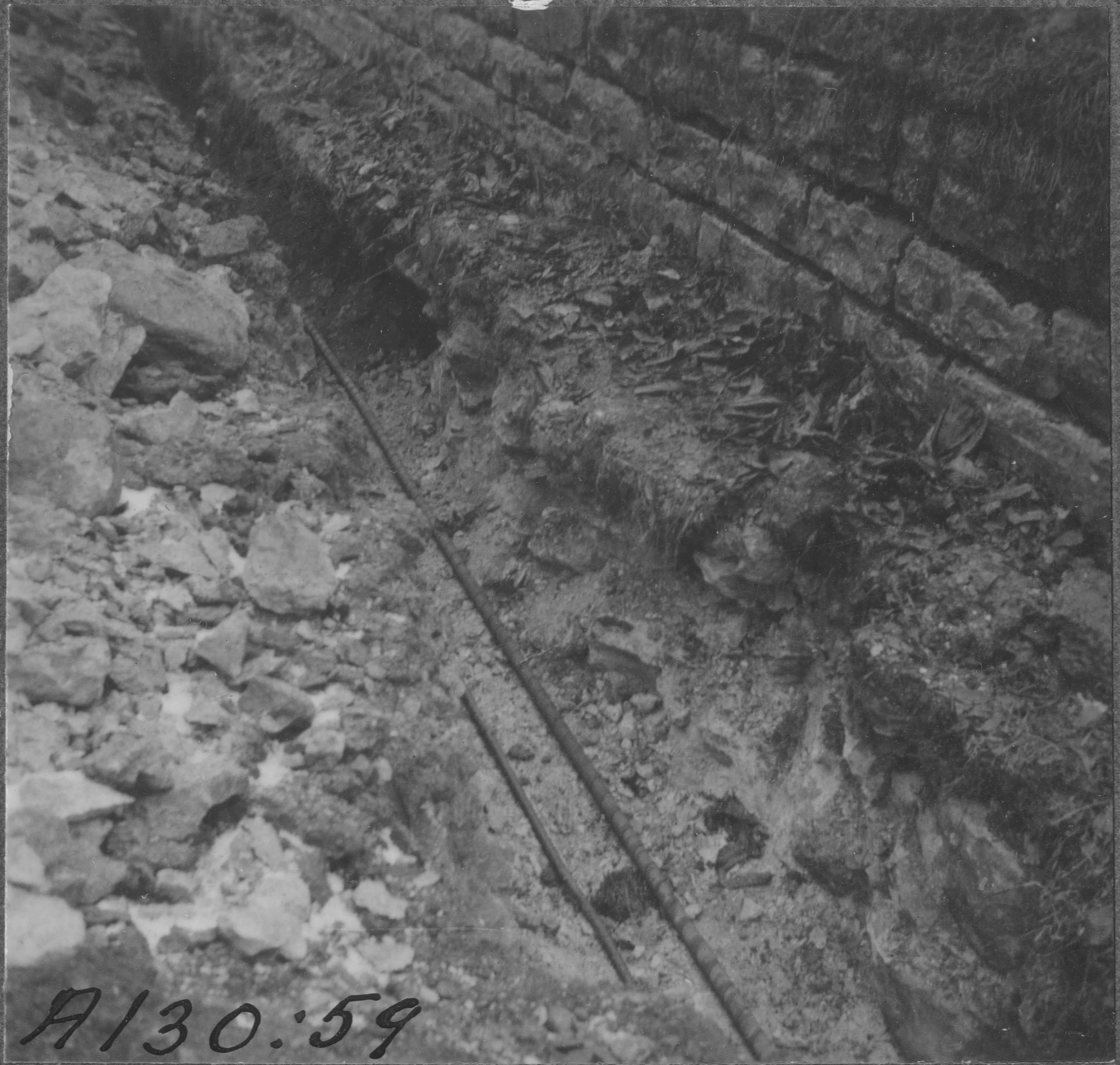 Beskrivning: Byggnadslämningar genombrutna av ränna för el-ledningar, vid vägen till prästgården. Fotot troligen från 1948.