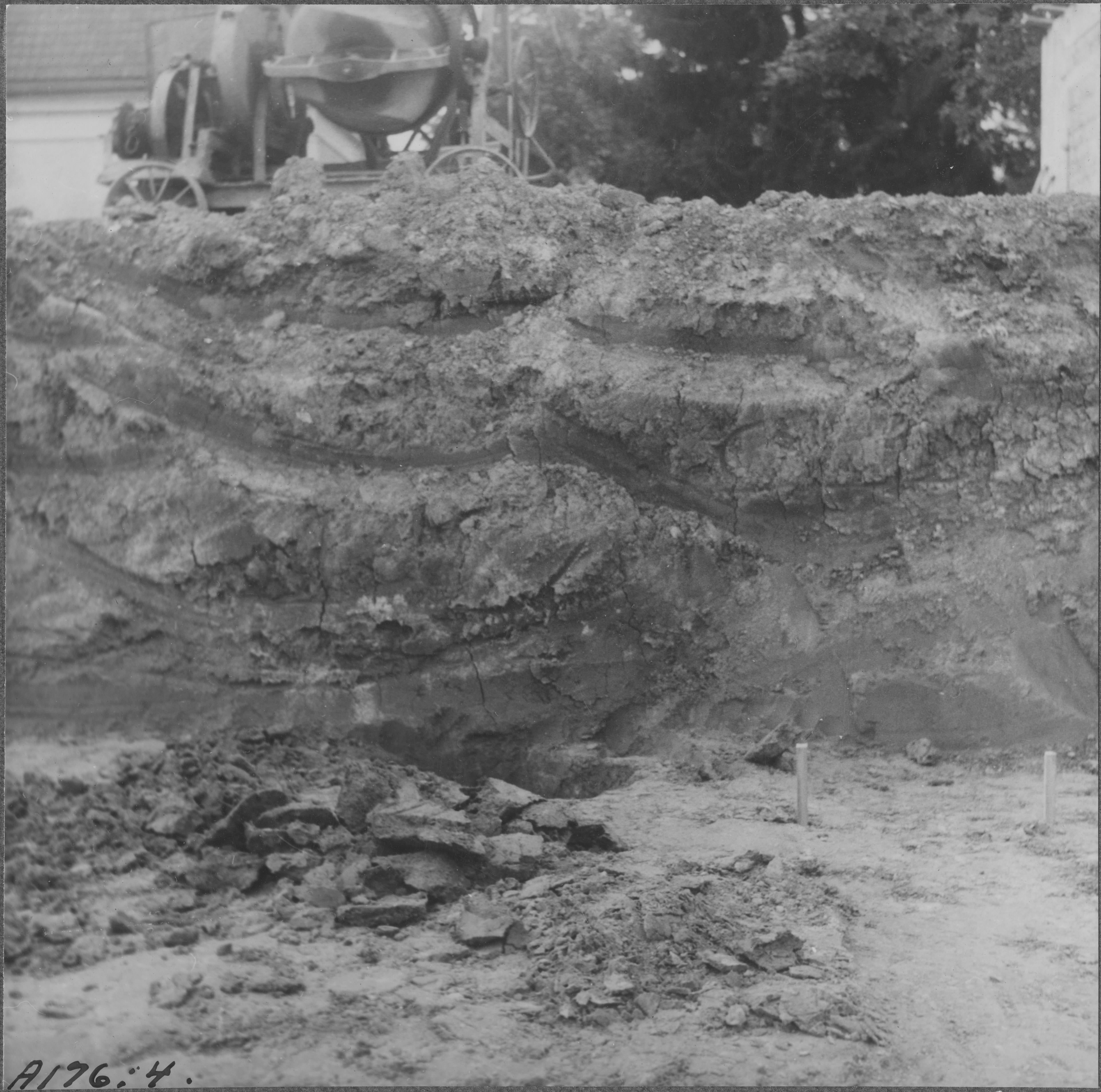 Beskrivning: Detalj av vattenledning i grund för ny skolbyggnad. Schaktväggen och nedtill den snett mot väggen löpande stensatta rännan, från öster. Fyndplats III.