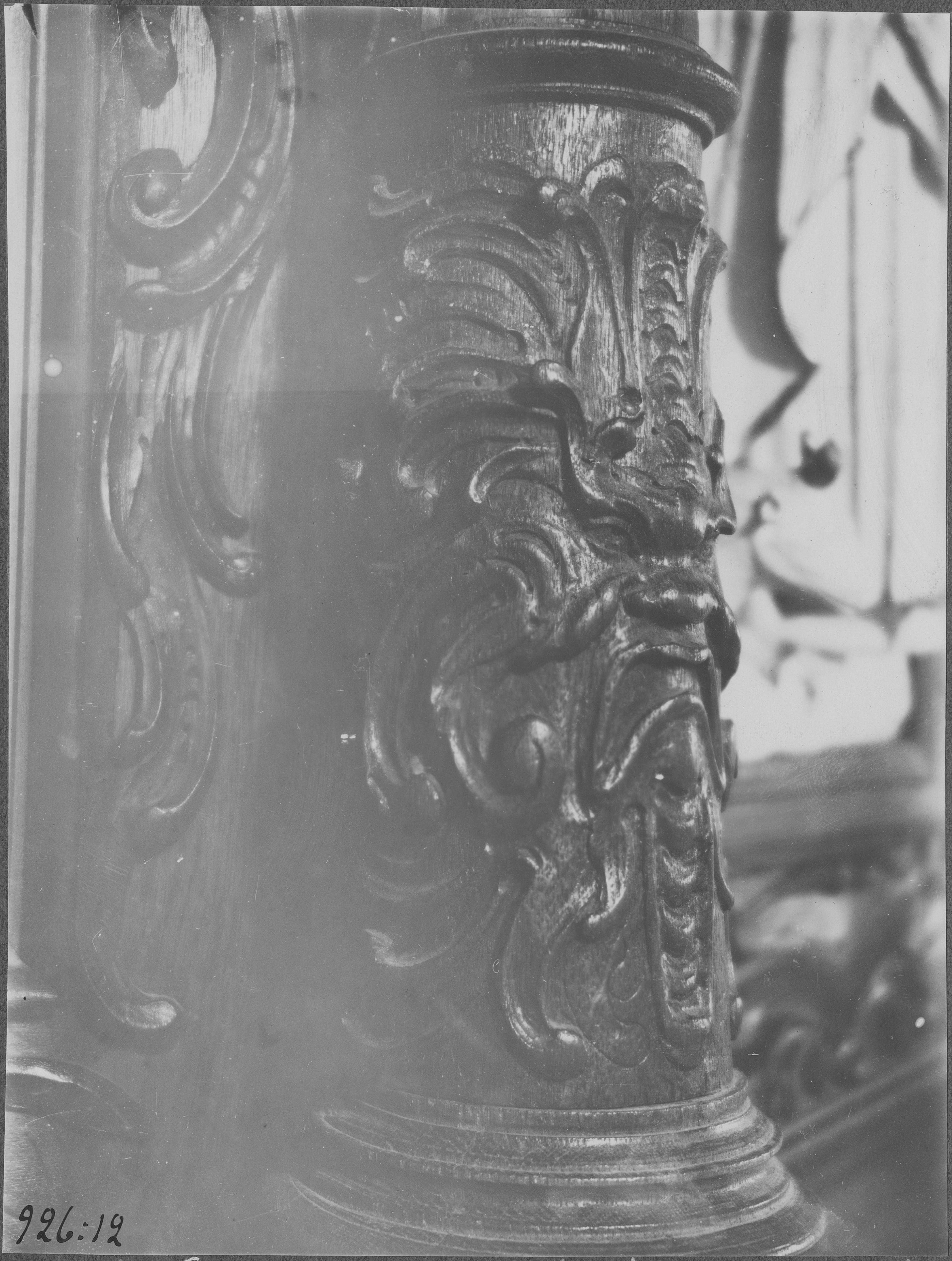 Beskrivning: Detalj av predikstolen, snidad maskaron.