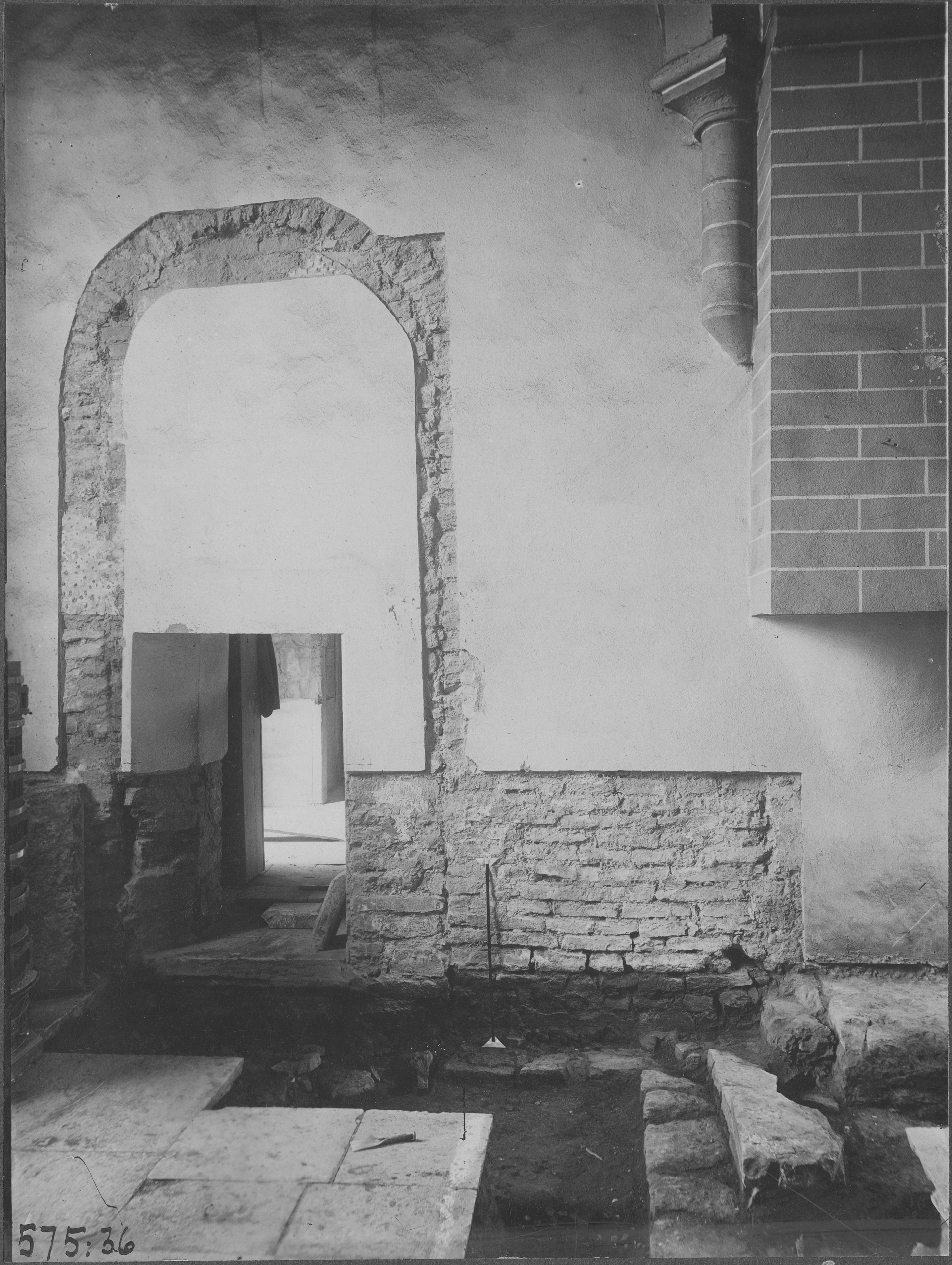 Beskrivning: Norra tvärskeppets östra vägg. Efter putsavknackning. På väggen syns den igensatta absidöppningen. Nederst till höger den uppgrävda grunden till den avhuggna pilastern, och trappsteg.