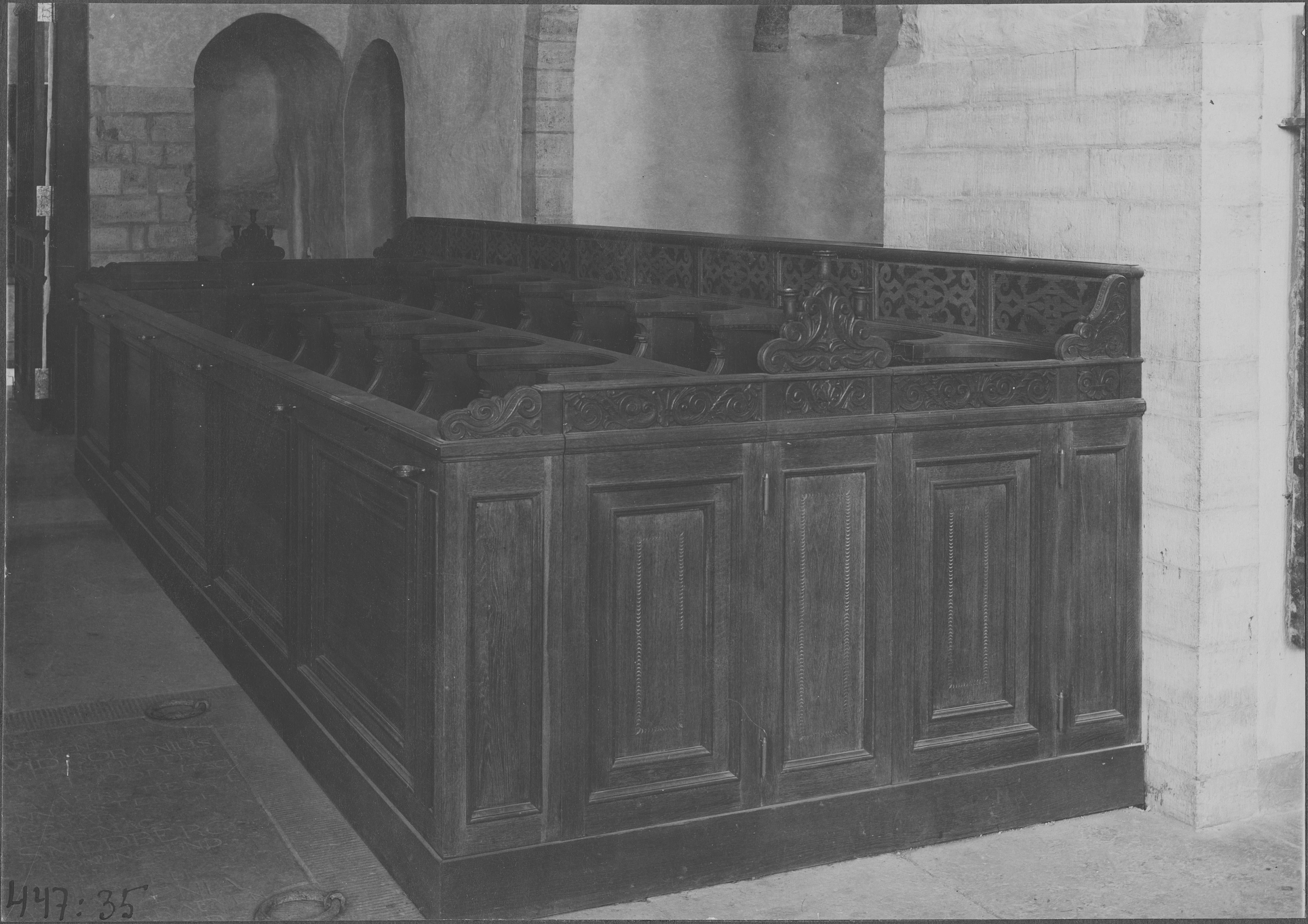 Beskrivning: Norra korbänken, efter restaurering. Fotot troligen från 1917.