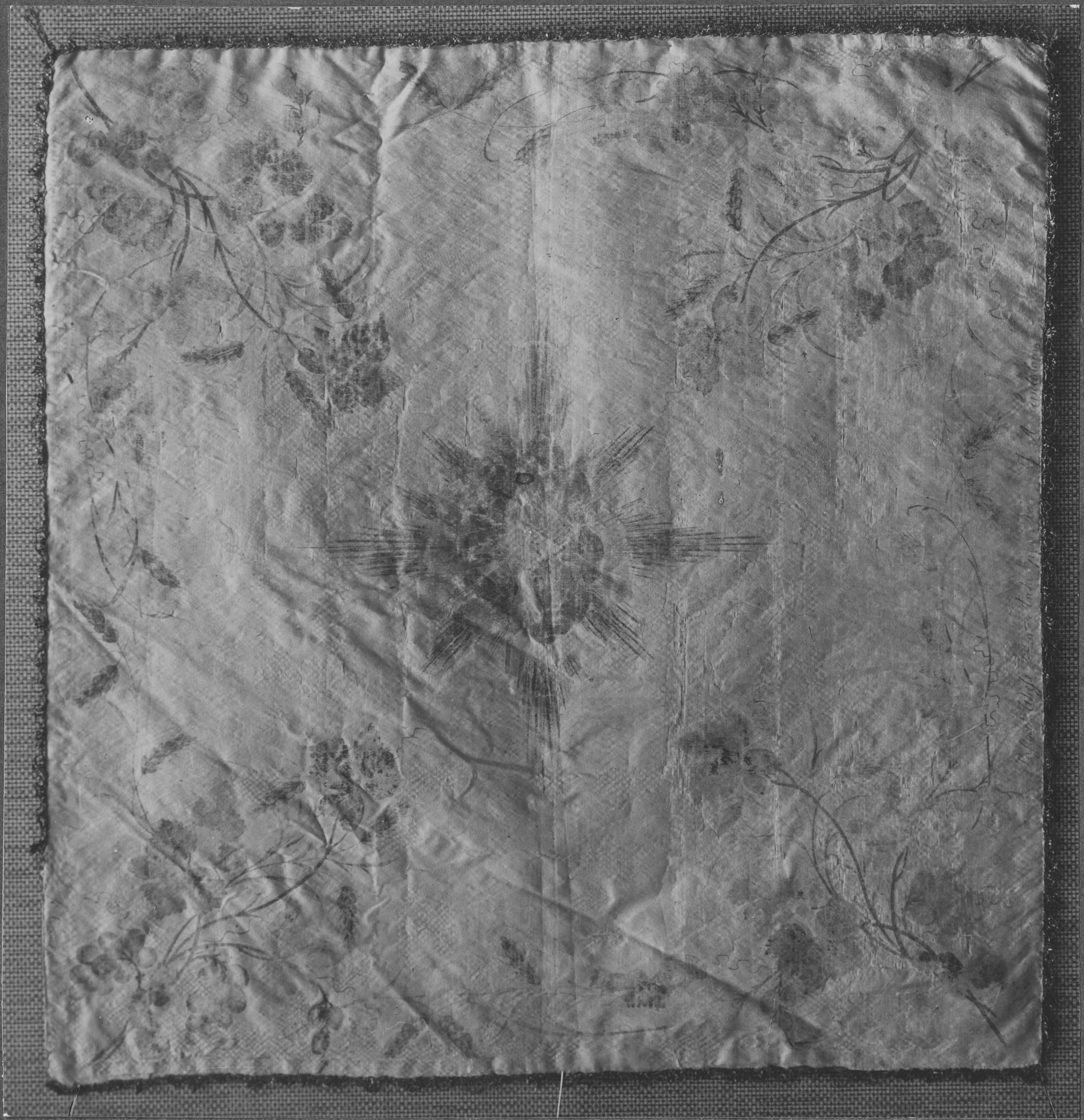 Beskrivning: Kalkkläde av gulvitt siden med silverfrans. Dekorerad med målade vinrankor och sädesax samt korset och törnekronan i strålkrans. Skänkt 1805. Fotot efter konservering vid Pietas (376/1917).