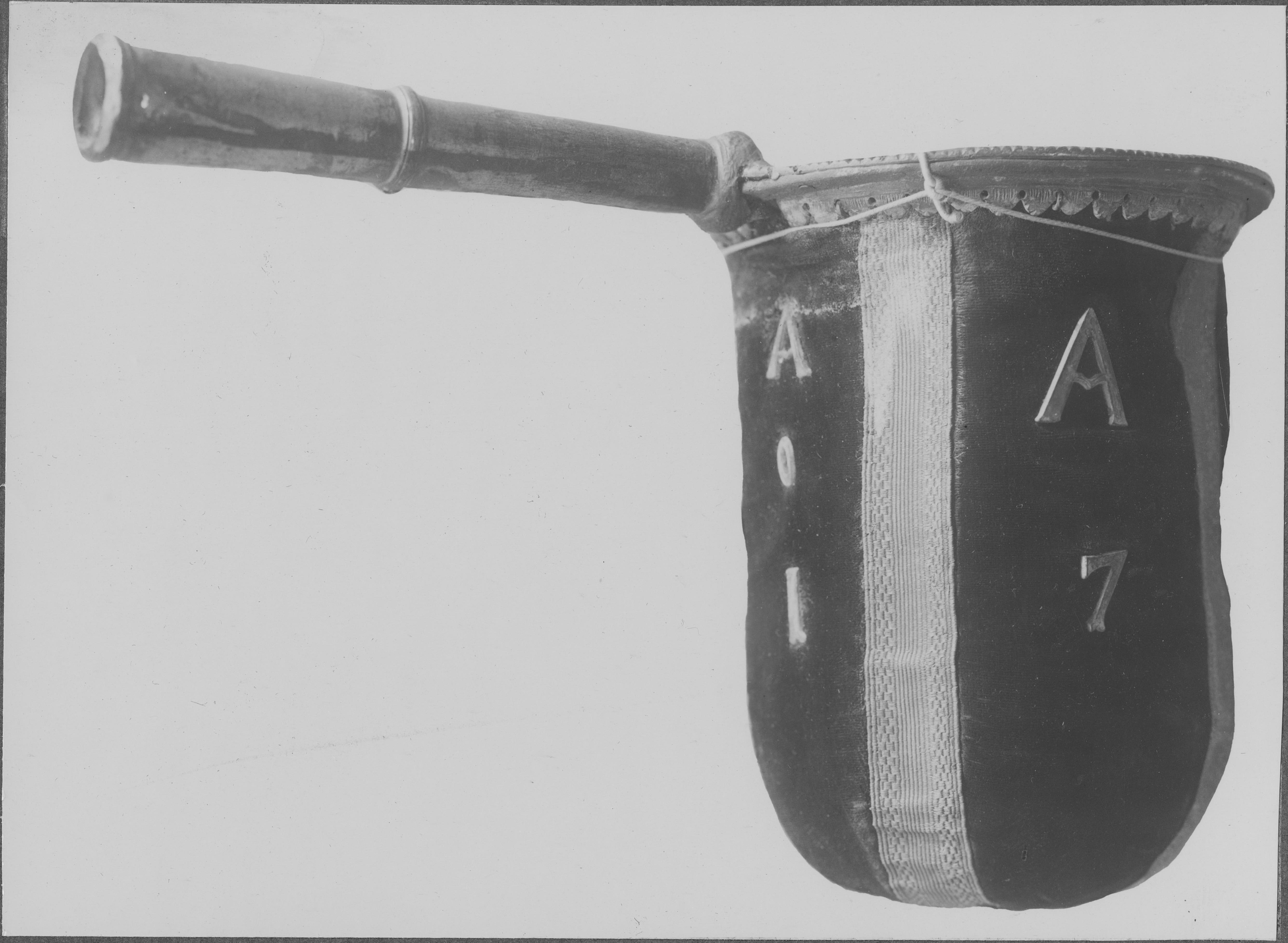 Beskrivning: Kollekthåv av mörk, grönbrun sammet med silvergaloner, från 1743. Efter konservering vid Pietas.