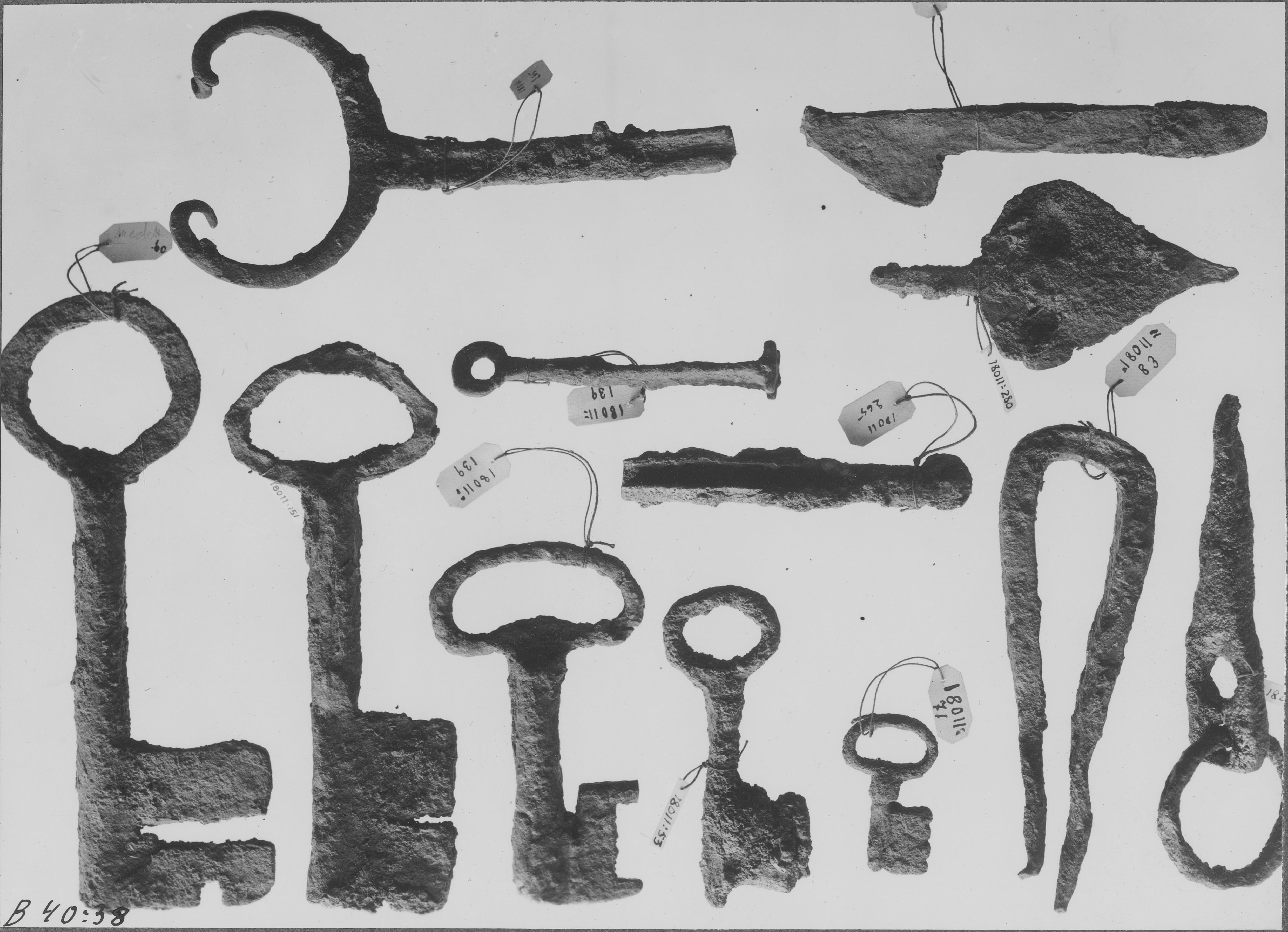 Beskrivning: Bultlåsnycklar, dörrklinka mm. SHM invnr 18011. Deposition i Vreta kloster.