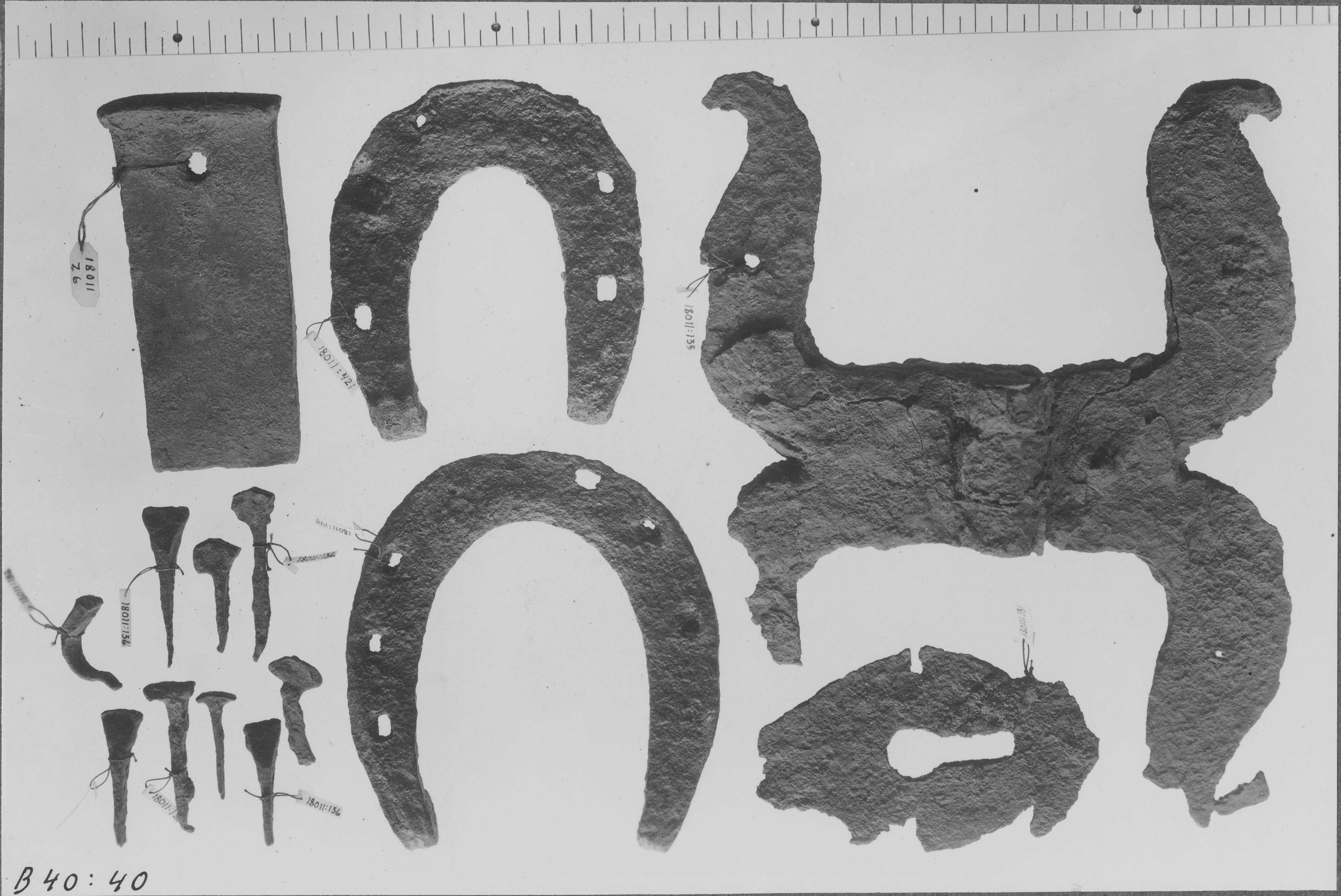 Beskrivning: Dörrbeslag, hästskor mm. SHM invnr 18011. Deposition i Vreta kloster.